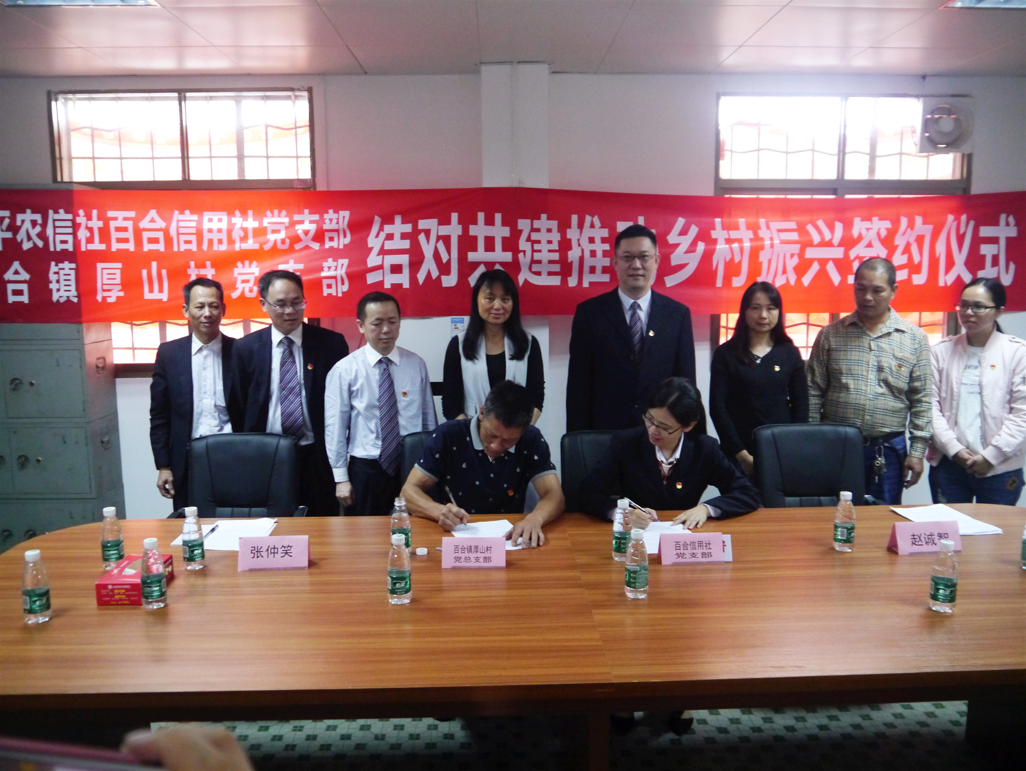3月27日上午,亚星 农信社百合信用社党支部与百合镇厚山村党总支部,在厚山村党支部会议室举行了结对共建推动乡村振兴的签约仪式,镇党委副书记张仲笑,亚星 农信社党委委员、纪委书记赵诚智,百合信用社党支部书记劳柳容,厚山村支部书记关喜辉以及两支部的党员干部参加签约仪式。