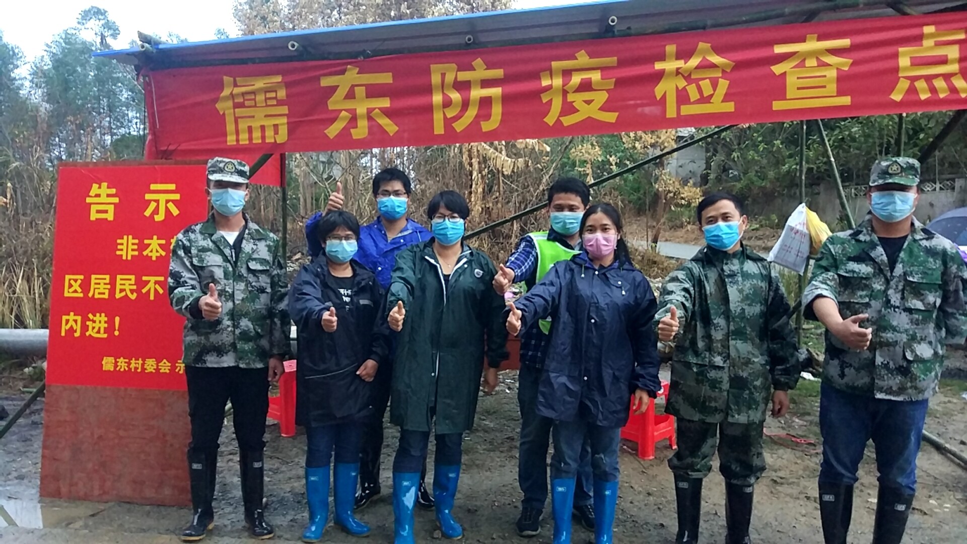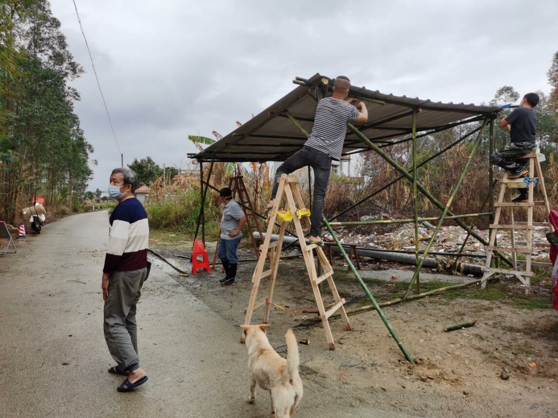 “昨天下了一整晚的雨,儒东黄烈检疫站点遮阳棚出现了裂缝,真是屋漏偏逢连夜雨……”直到早上雨还一直下个不停,党支部书记胡桂影在“儒东防疫防控工作”微信群里无奈地吐槽了一下。哪知不一会儿,防疫站前就已经聚集了一群义工队、无职党员、村民,他们纷纷抡起工具,砍起竹子,找来了铁棚,重新搭起了防疫工作站。党员义工队里有装修的经验的负责指挥,一群人分工合作,一下子就在检疫站处搭好了遮雨棚。硬是把一个临时站点,“豪装”成一个稳固的工作站。