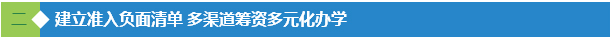 ● 放宽办学准入条件——社会力量投入教育,只要是不属于法律法规禁止进入以及不损害第三方利益、社会公共利益、国家安全的领域,政府不得限制。政府制定准入负面清单,列出禁止和限制的办学行为。