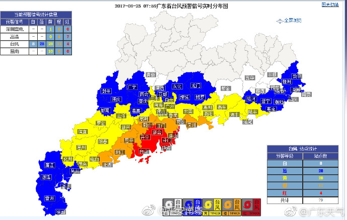 截至8时02分,全省共有79个台风预警信号生效,其中珠海、斗门、新会、台山发布了台风红色预警信号。预计,“天鸽”继续以25公里左右时速向西偏北方向移动,预计中午到傍晚在深圳到阳江一带沿海登陆。