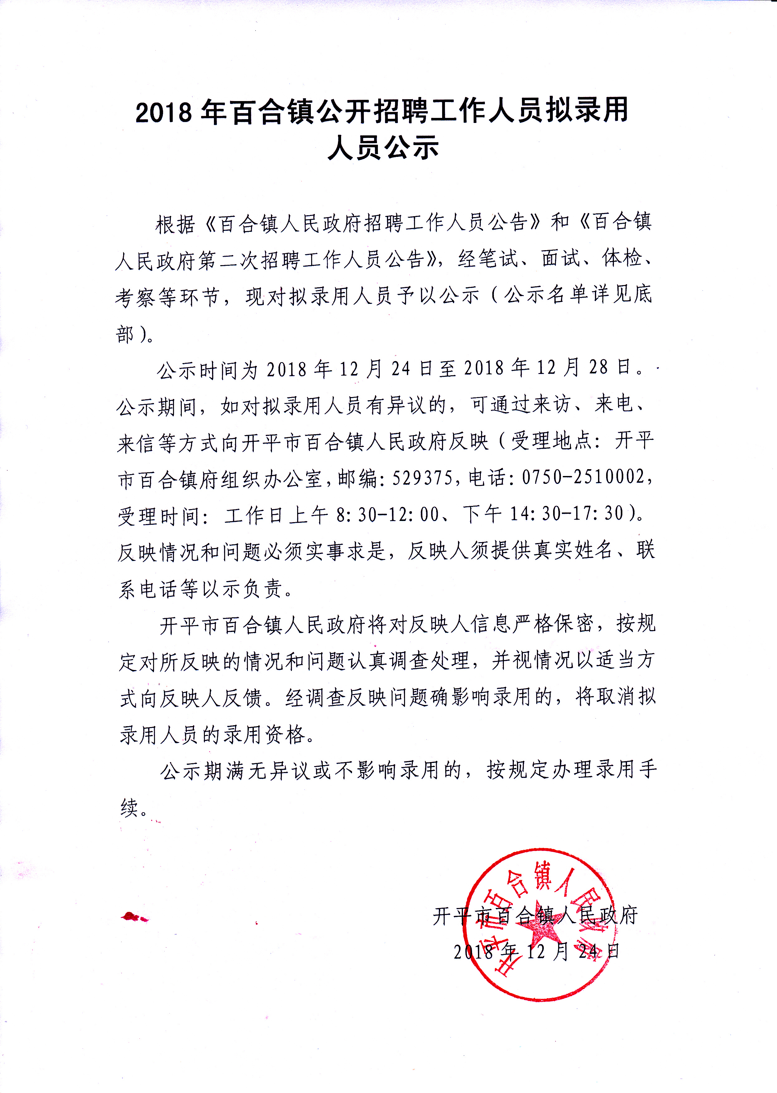 2018年百合镇公开招聘工作人员拟录用人员公示
