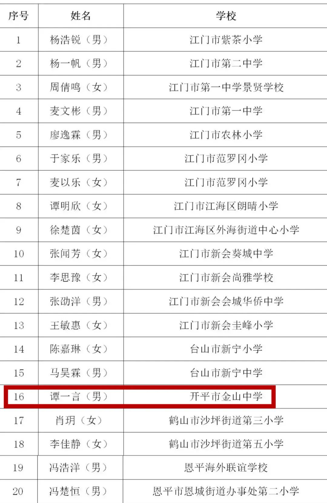 关于2020年上半年江门“新时代好少年”的通报 各市、区文明办、教育局、团委、妇联、关工委,市各有关单位: 江门市文明办 江门市教育局 共青团江门市委员会 江门市妇女联合会 江门市关心下一代工作委员会 2020年9月14日 2020年上半年江门“新时代好少年”名单