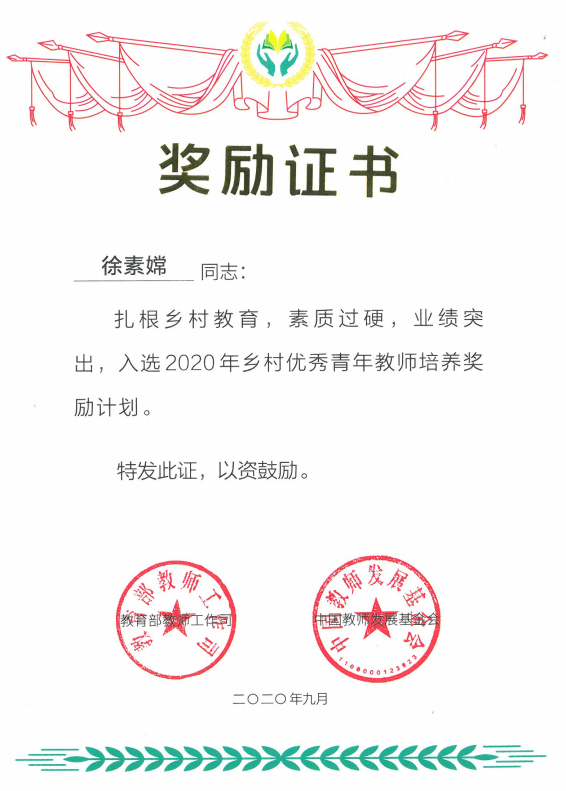 第一中学地理科徐素嫦老师成为江门市唯一入选名单,获得1万元奖励并入选教育部教师工作司实施的名师领航工程,纳入名师工作室进行培养。同时,广东省教育厅也将入选的乡村优秀青年教师纳入骨干教师、名师培养序列,予以重点支持和培训。