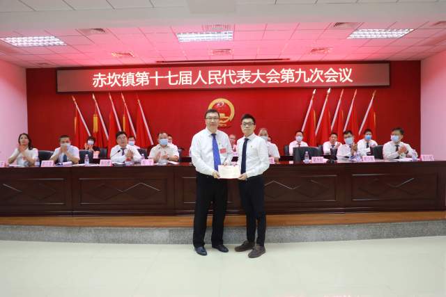 会议还依法选举赤坎镇人民政府镇长,经过无记名投票,梁杰钊同志依法当选。陈杰文为其颁发当选证书。