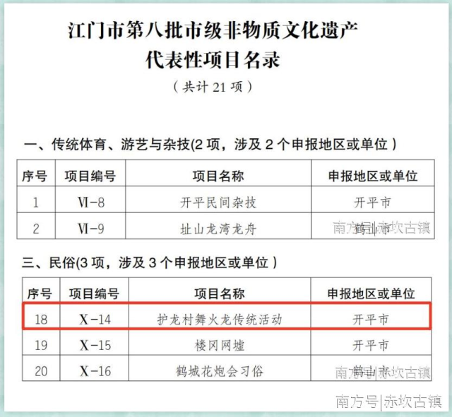 近日,江门市人民政府公布江门市第八批市级非物质文化遗产代表性项目名录,亚星官网 赤坎镇护龙村舞火龙传统活动榜上有名,成功入选为江门市级非遗项目!