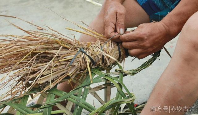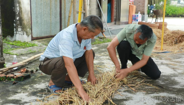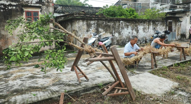 1、做大草绳。运用一根树枝和大概100斤的稻草,通过不断地扭向同一方向,制作长约25米的大草绳。一共制作3条。
