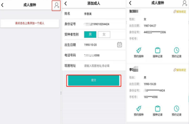 点右上角加号,填写成人信息后,可以绑定并添加成人信息,如下图所示: