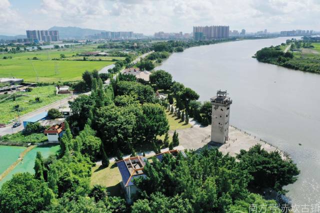 南楼,是爱国主义教育基地。屹立于潭江河畔的这座碉楼,烈日照耀下,榜书大字“南楼”十分显眼。楼体清晰可见斑驳的墙体上密布的弹坑炮孔、黑色不锈钢板后坚固的钢筋窗……看到这些,彷佛向人们述说一段悲壮的往事……