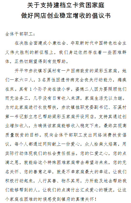 赤坎镇党委政府贯彻落实中央关于扶贫攻坚的总体要求,对刘付春红施予关怀,帮助其通过积极创业,家庭收入有了稳步提高,最终实现脱贫的目标。我们希望,像刘付春红这样的贫困家庭,能够得到社会各界更多的关心帮助。也呼吁社会各界人士能够积极响应倡议,给赤坎更多的贫困家庭送上温暖,营造良好的助贫社会氛围。