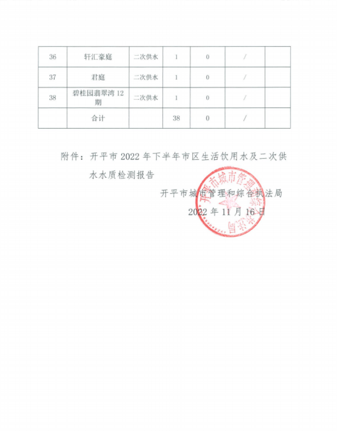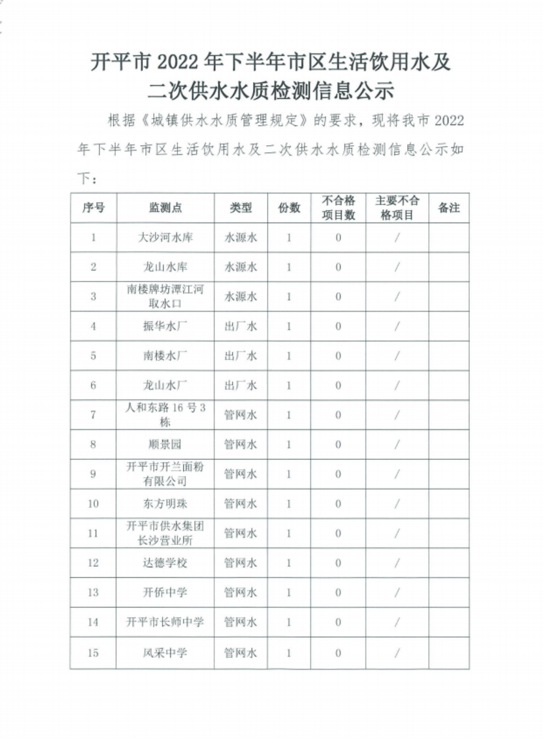 亚星官网 2022年下半年市区生活饮用水及二次供水水质检测信息公示