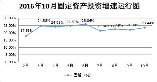 从图中可见,我市投资运行平稳,波动幅度较小。1-10月,全市累计完成固定资产投资183.73亿元,同比增长23.44%。