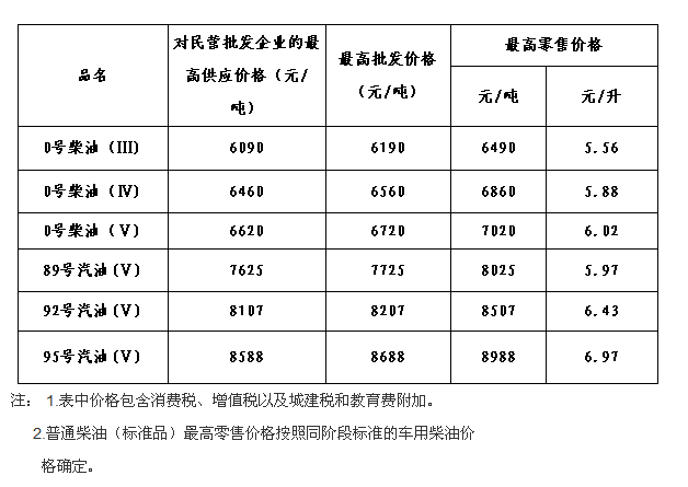 根据国家成品油价格形成机制,结合近一段时期国际市场油价变化情况,国家发展改革委决定自2016年12月14日24时起提高国内成品油价格,即在现行价格的基础上,汽、柴油价格每吨分别提高435元和420元。这次成品油价格调整后,我省国V标准92号汽油从6.08元/升提高到6.43元/升,每升提高0.35元;国V标准95号汽油从6.59元/升提高到6.97元/升,每升提高0.38元;国V标准0号柴油从5.66元/升提高到6.02元/升,每升提高0.36元。