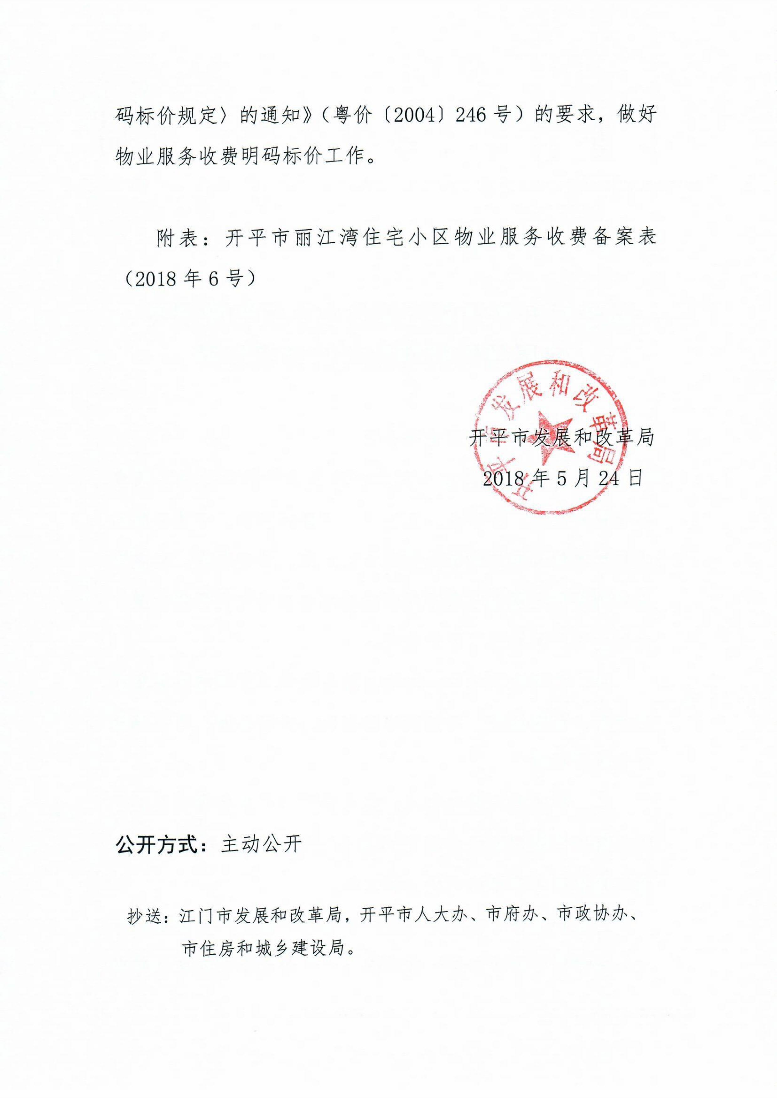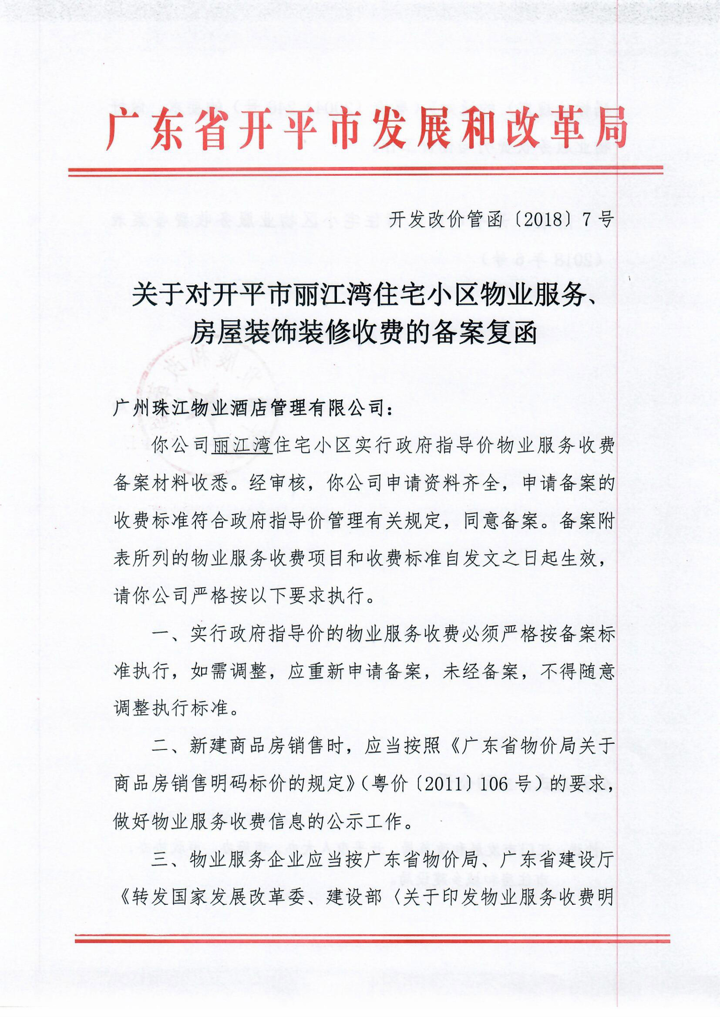 (开发改价管函〔2018〕7号)关于对亚星官网 丽江湾住宅小区物业服务、房屋装饰装修收费的备案复函