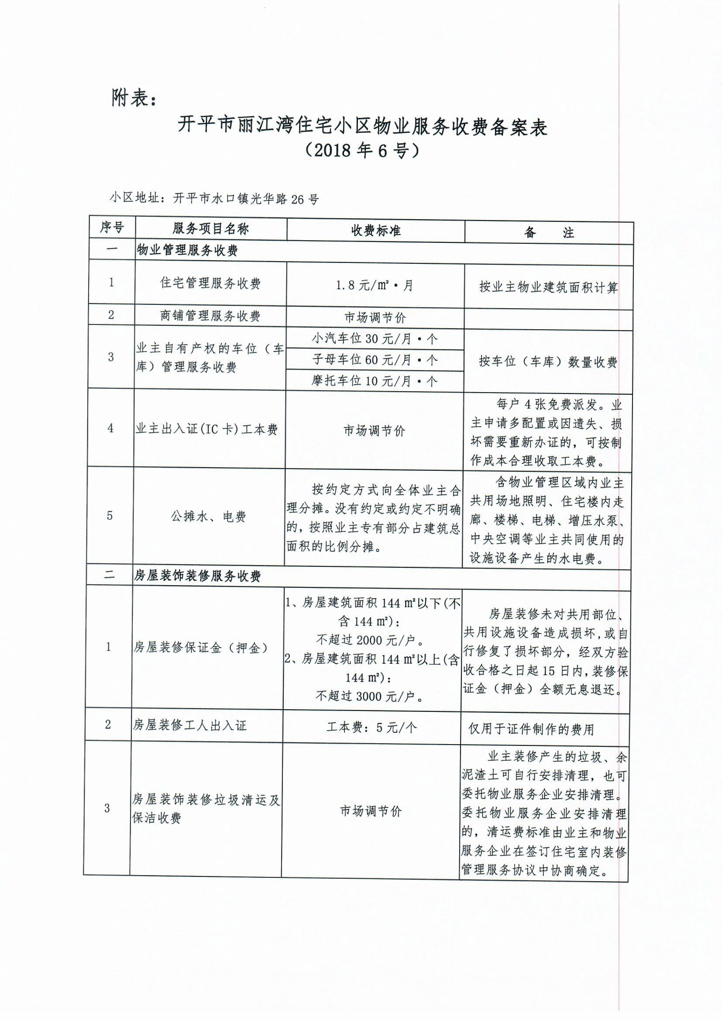 开发改价管函〔2018〕7号 关于对亚星官网 丽江湾住宅小区物业服务、房屋装饰装修收费的备案复函
