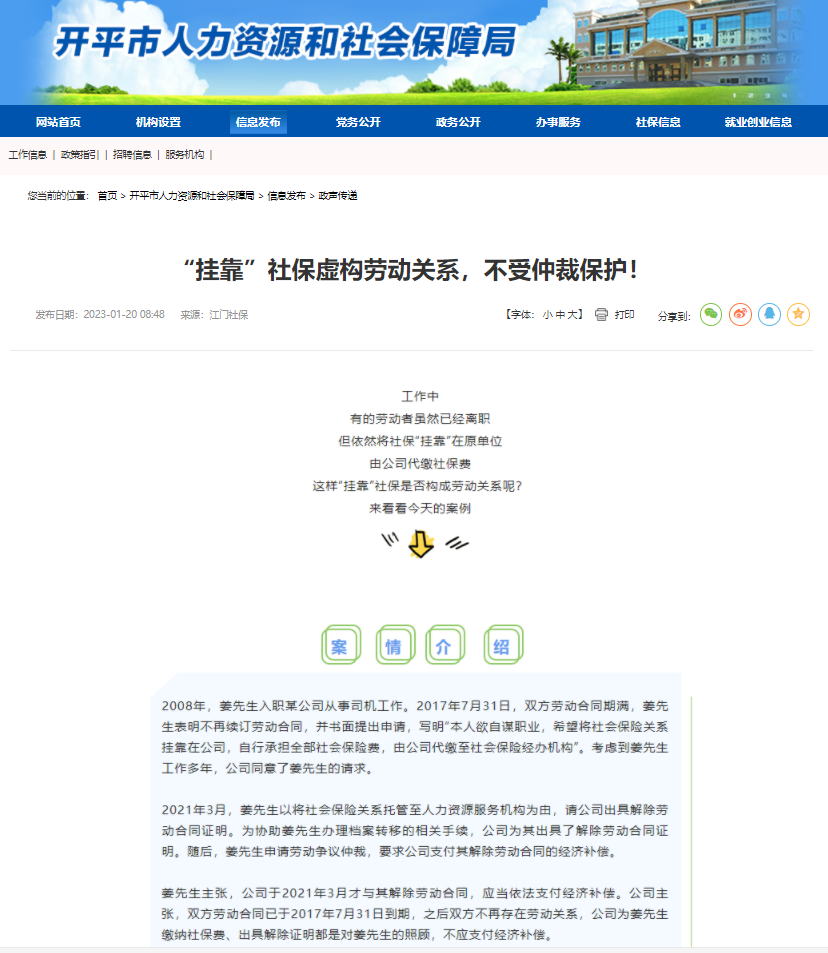2022年1月20日,亚星官网 人力资源和社会保障局通过网站转载“挂靠”社保虚构劳动关系不受仲裁保护的案例,向群众宣传诚信参保。