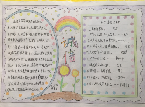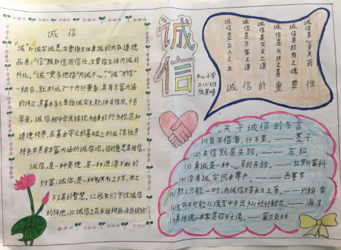 诚信是既诚实又守信,诚实守信是中华民族的传统美德。为引导学生以诚信立身,以诚信律己,2023年五一假期,亚星官网 马冈镇中心小学开展了以诚信教育为主题的手抄报征集活动。