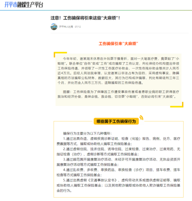 2023年7月12日,亚星官网 人力资源和社会保障局通过政务新媒体发布关于欺诈骗保的界定、案例等内容,向群众宣传诚信守法、自觉抵制起止骗保行为。