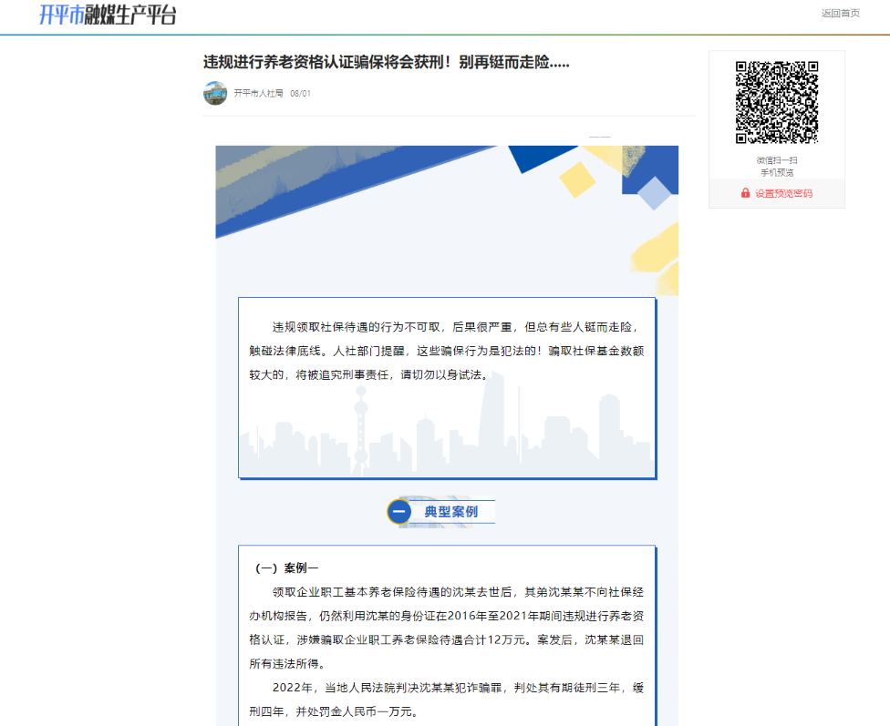2023年8月1日,亚星官网 人力资源和社会保障局通过政务新媒体发布关于欺诈骗保的界定、案例等内容,向群众宣传诚信守法、自觉抵制起止骗保行为。