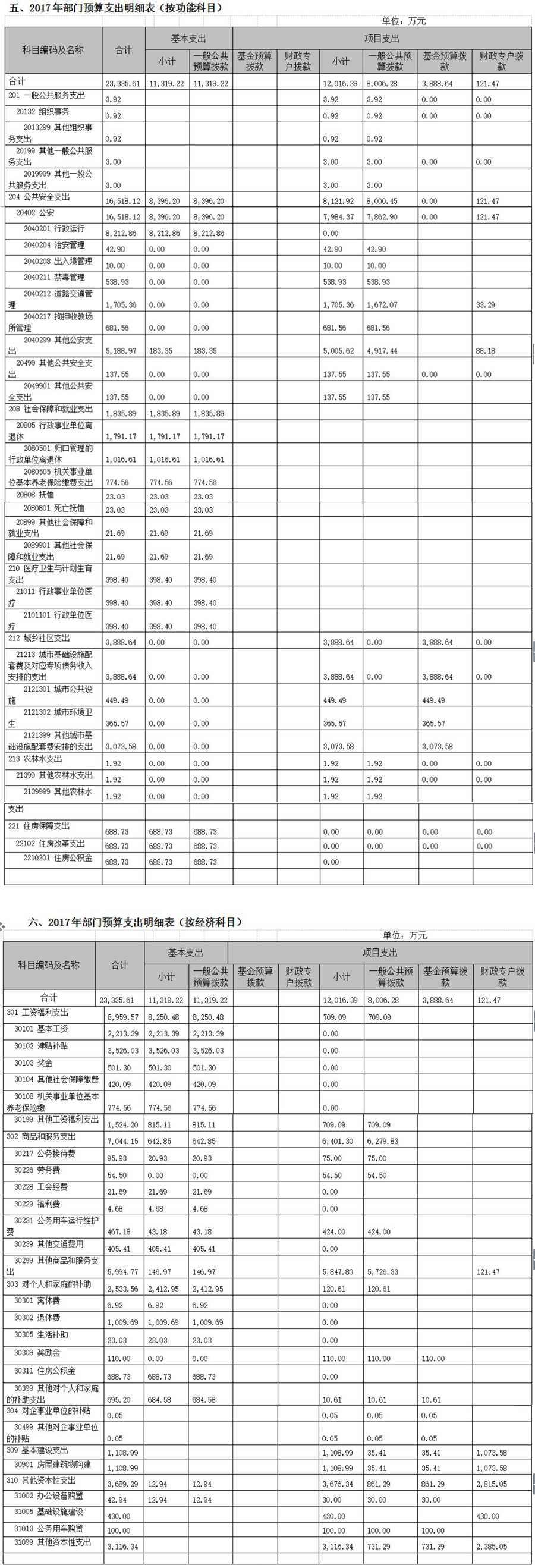 2017年支出预算23335.61万元,按用途划分,人员支出预算8250.48万元,占支出预算35.36%;日常公用支出预算 4015.79万元,占支出预算17.21 %;对个人和家庭的补助支出预算2412.95万元,占支出预算10.34%;项目支出预8656.39万元,占支出预算37.09%。