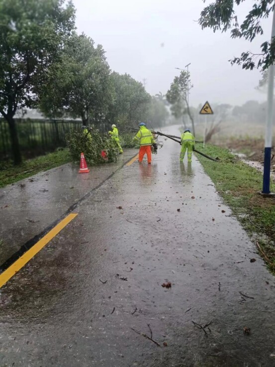 工作人员在处理倒伏树和竹枝,疏通桥涵泄水孔及排水沟