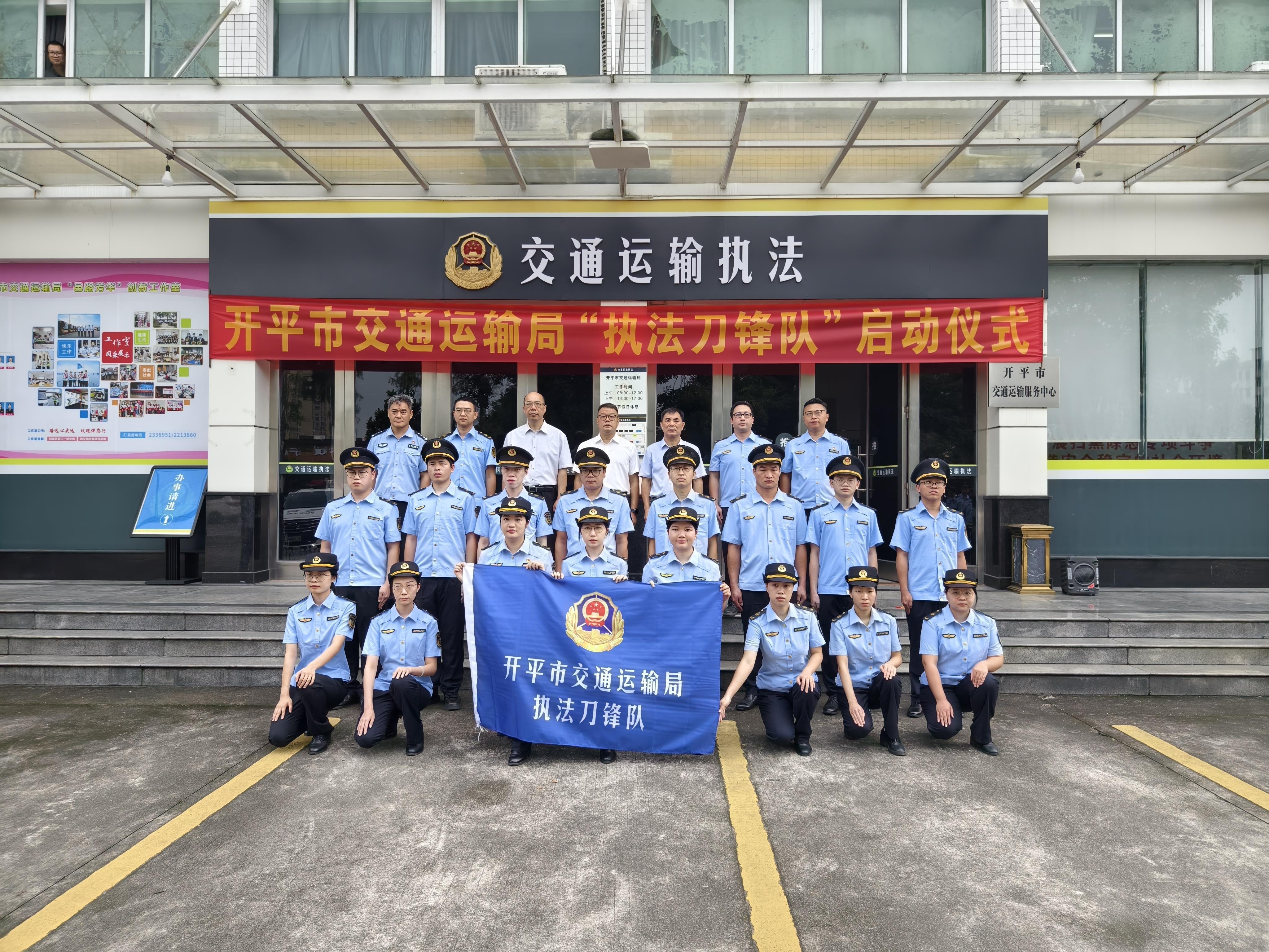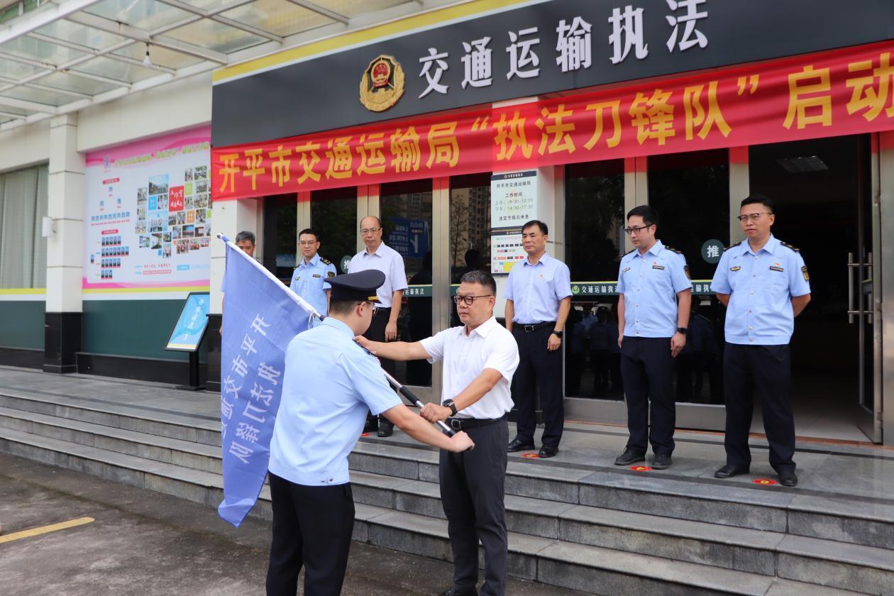 仪式上,江门市交通运输局党组成员、副局长黄振中宣布亚星官网 交通运输局执法刀锋队正式成立,并为执法刀锋队授旗,参会领导共同按响汽笛。伴随着“交通铁军勇担当,刀锋执法创新篇”嘹亮口号,亚星官网 交通运输局执法刀锋队全面展开执法行动。