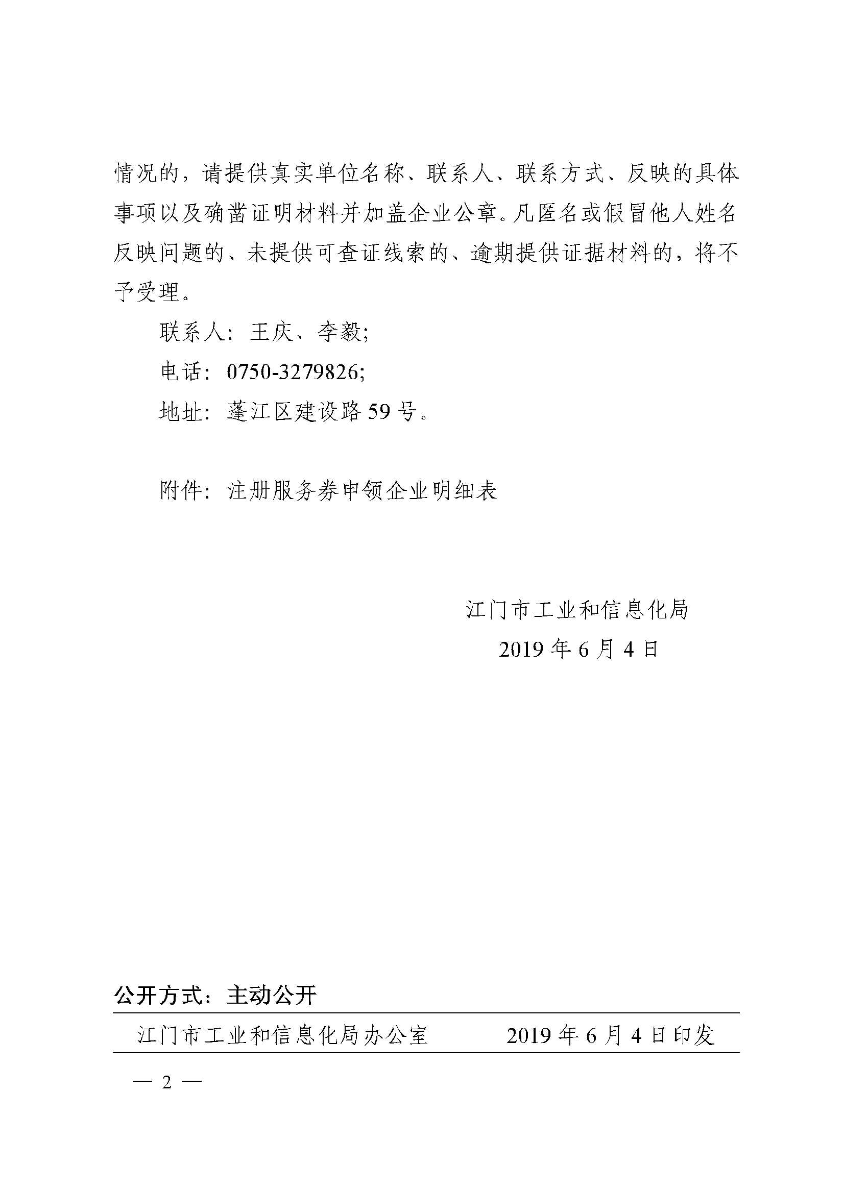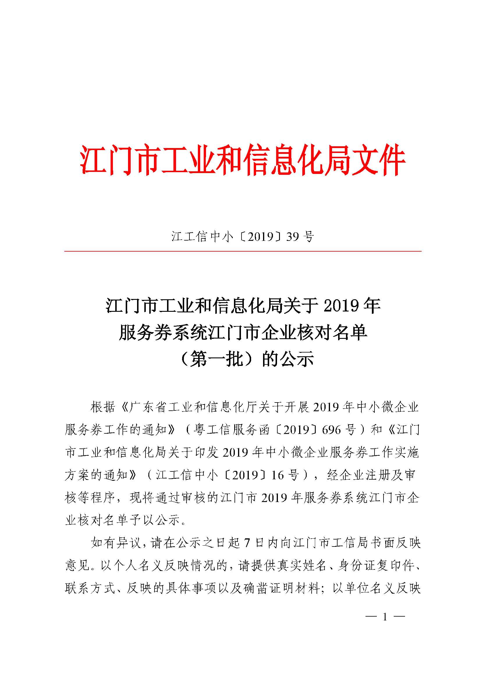 江门市工业和信息化局关于2019年服务券系统江门市企业核对名单(第一批)的公示