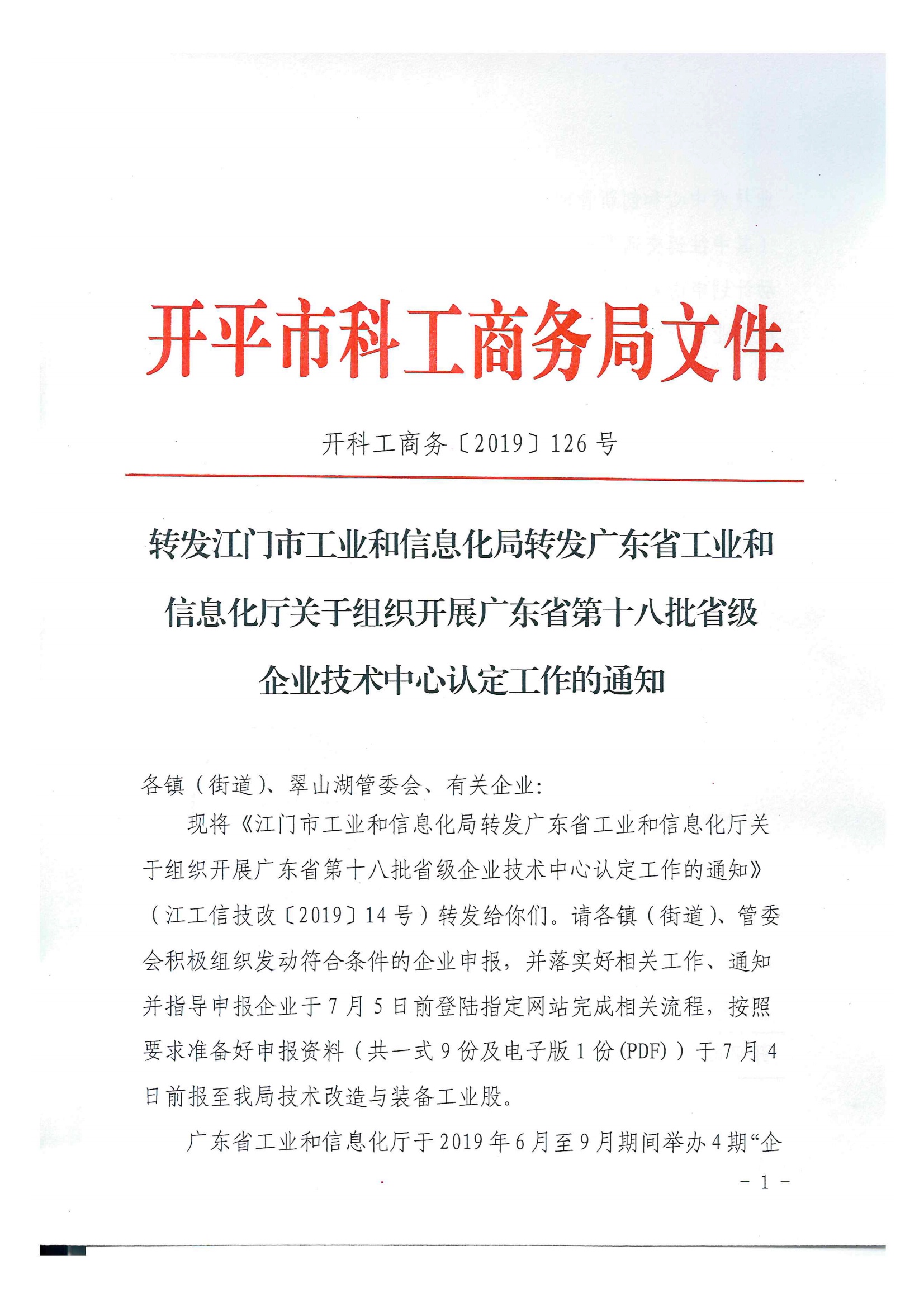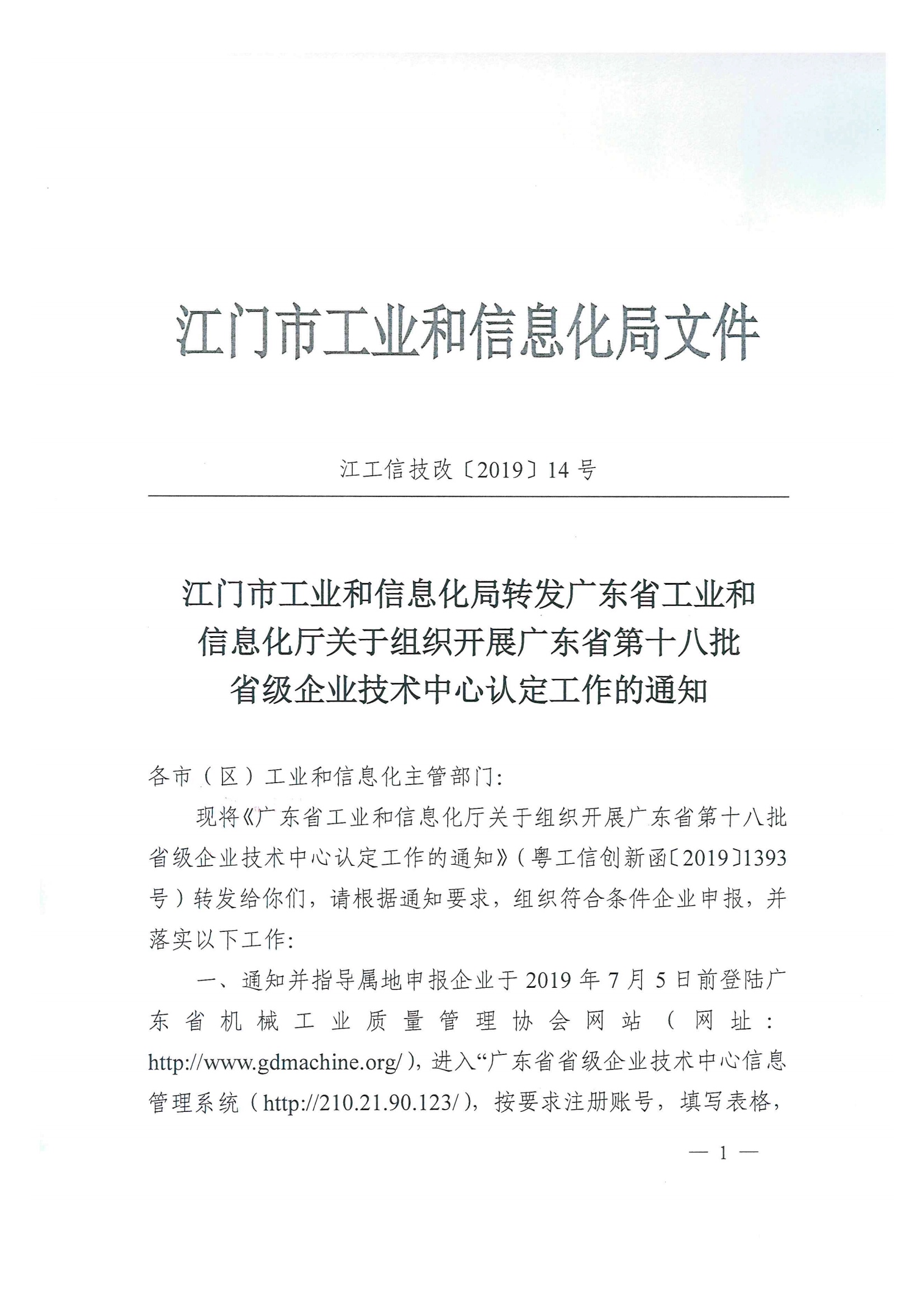 附件1:江门市工业和信息化局转发广东省工业和信息化厅关于组织开展广东省第十八批省级企业技术中心认定工作的通知(江工信技改〔2019〕14号)