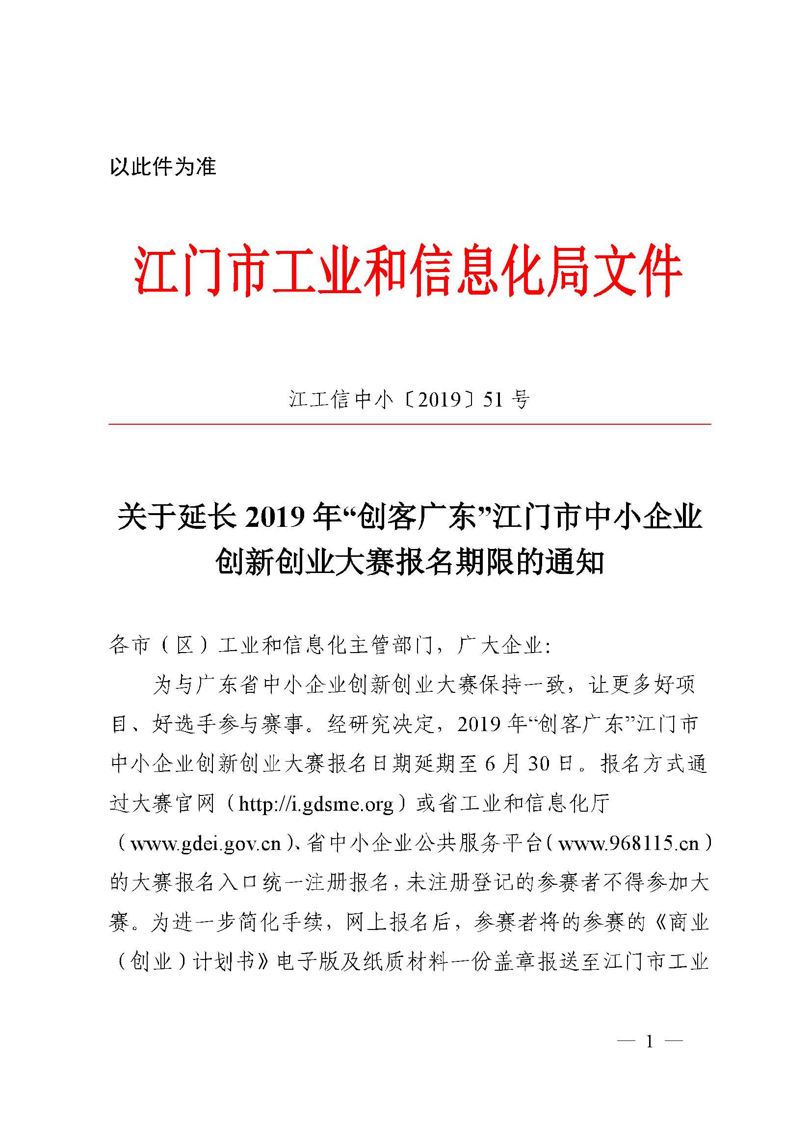 关于延长2019年“创客广东”江门市中小企业创新创业大赛报名期限的通知