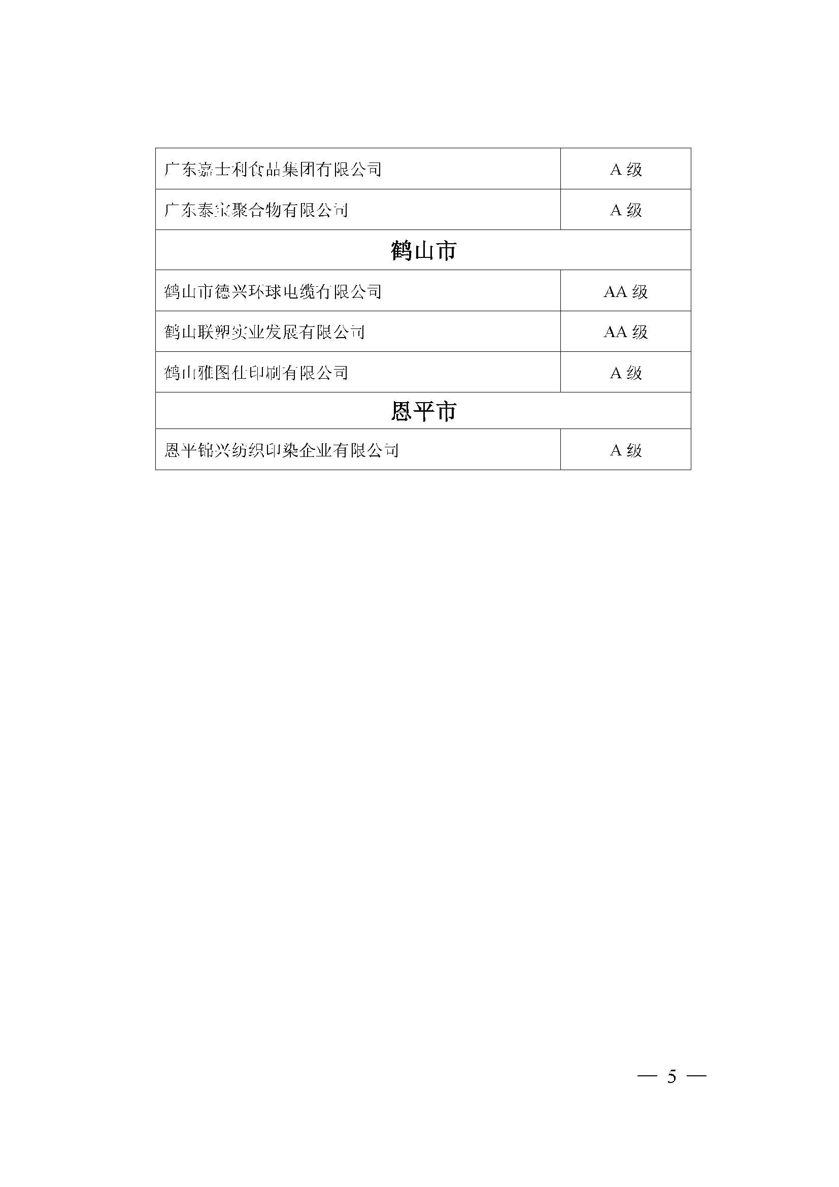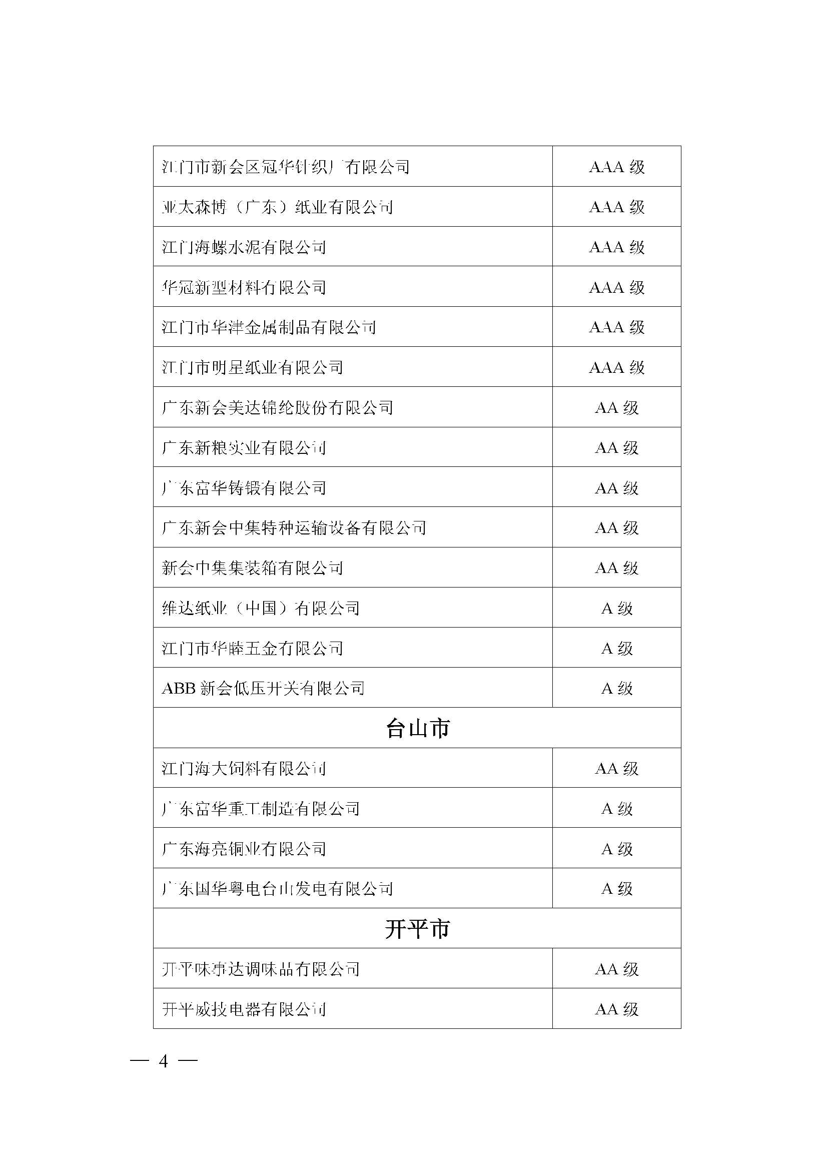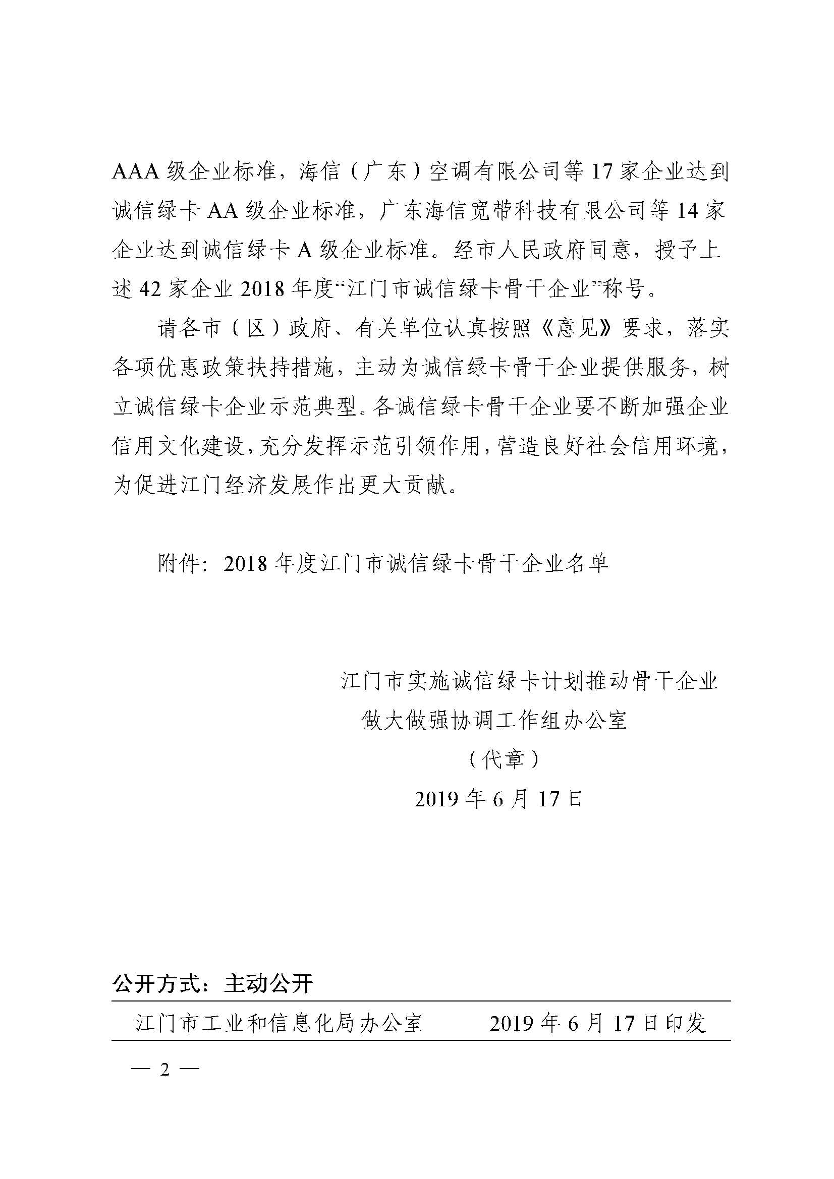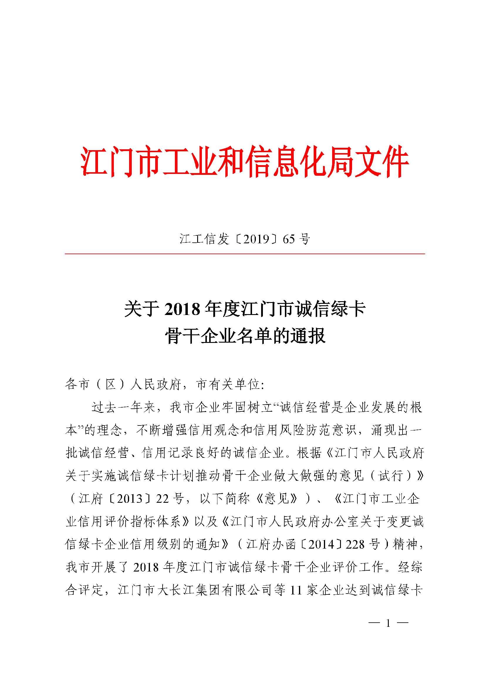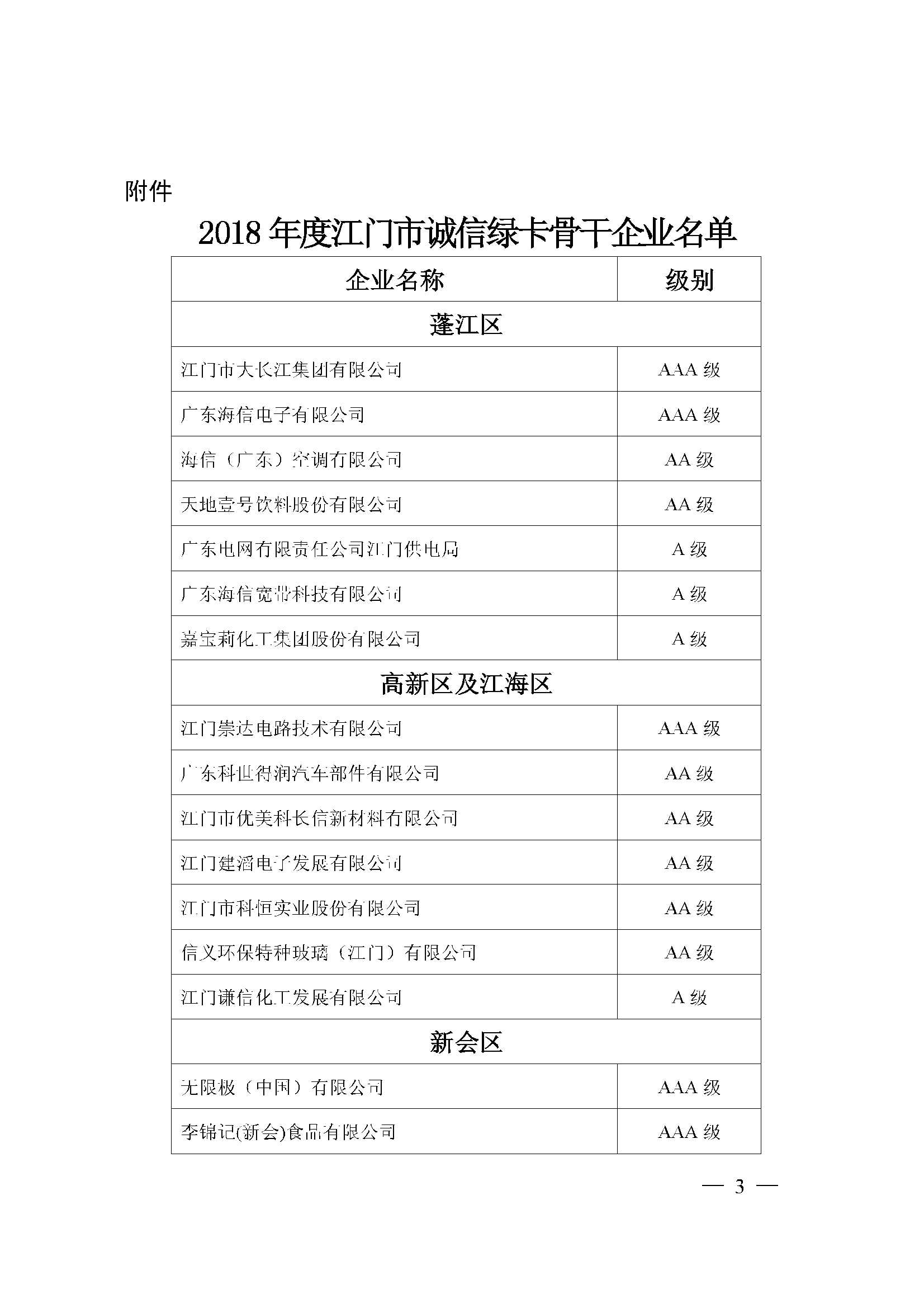 关于2018年度江门市诚信绿卡骨干企业名单的通报