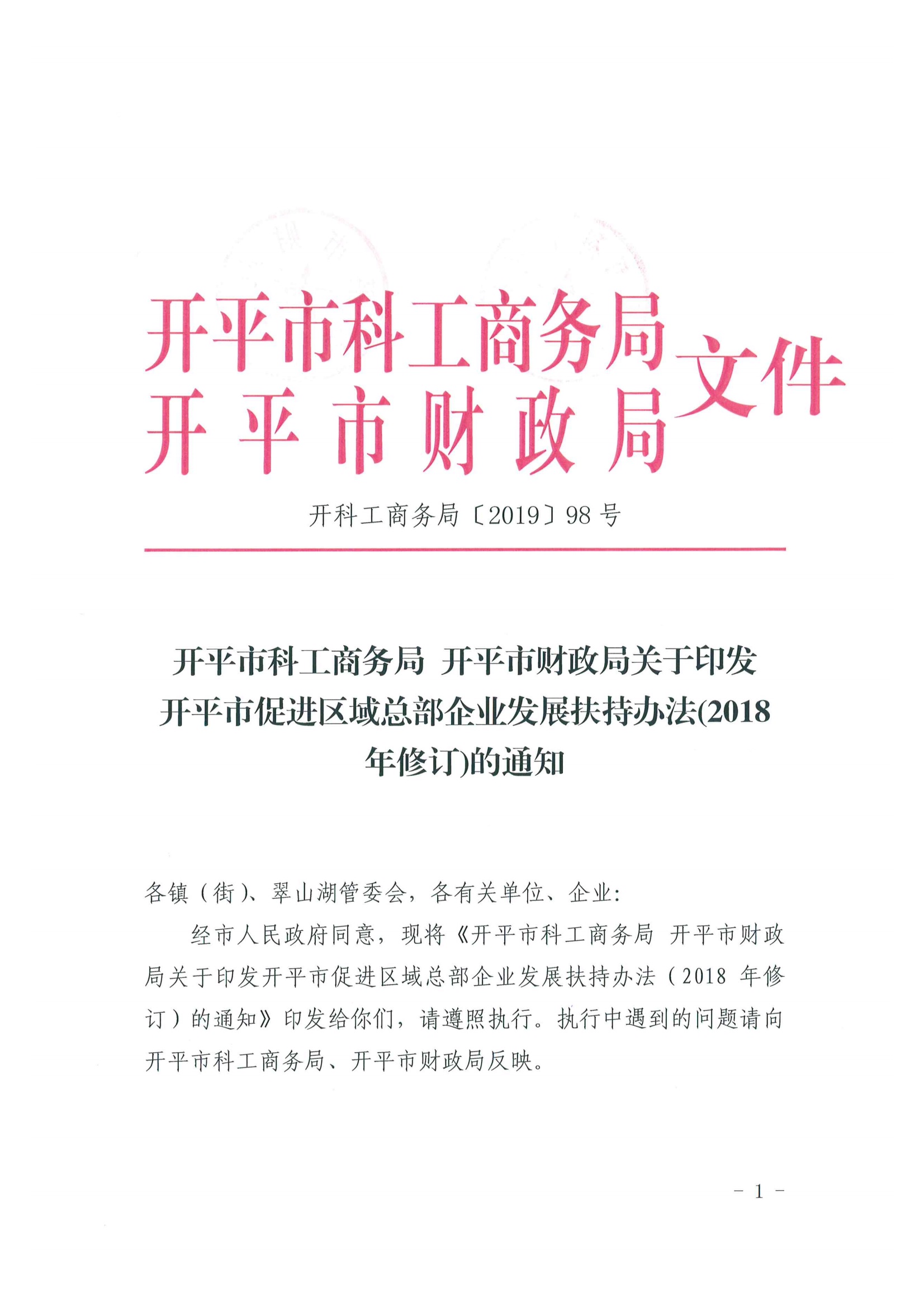 开科工商务[2019]98号亚星官网 科工商务局 亚星官网 财政局关于印发亚星官网 促进区域总部企业发展扶持办法(2018年修订)的通知
