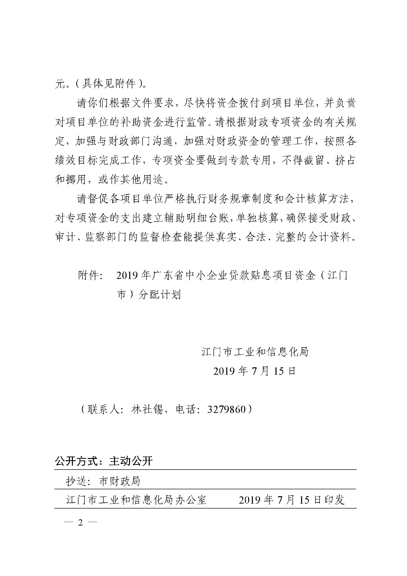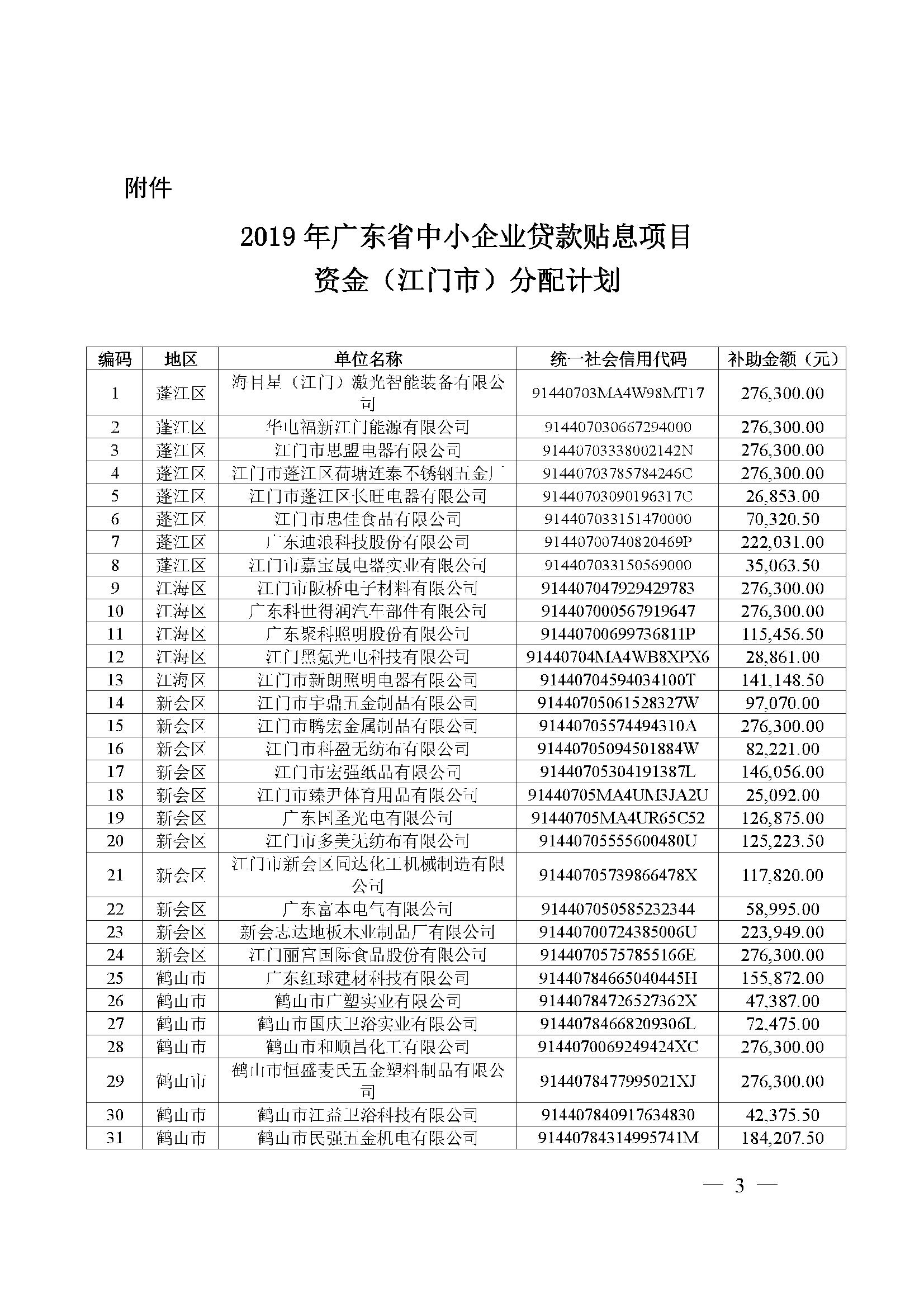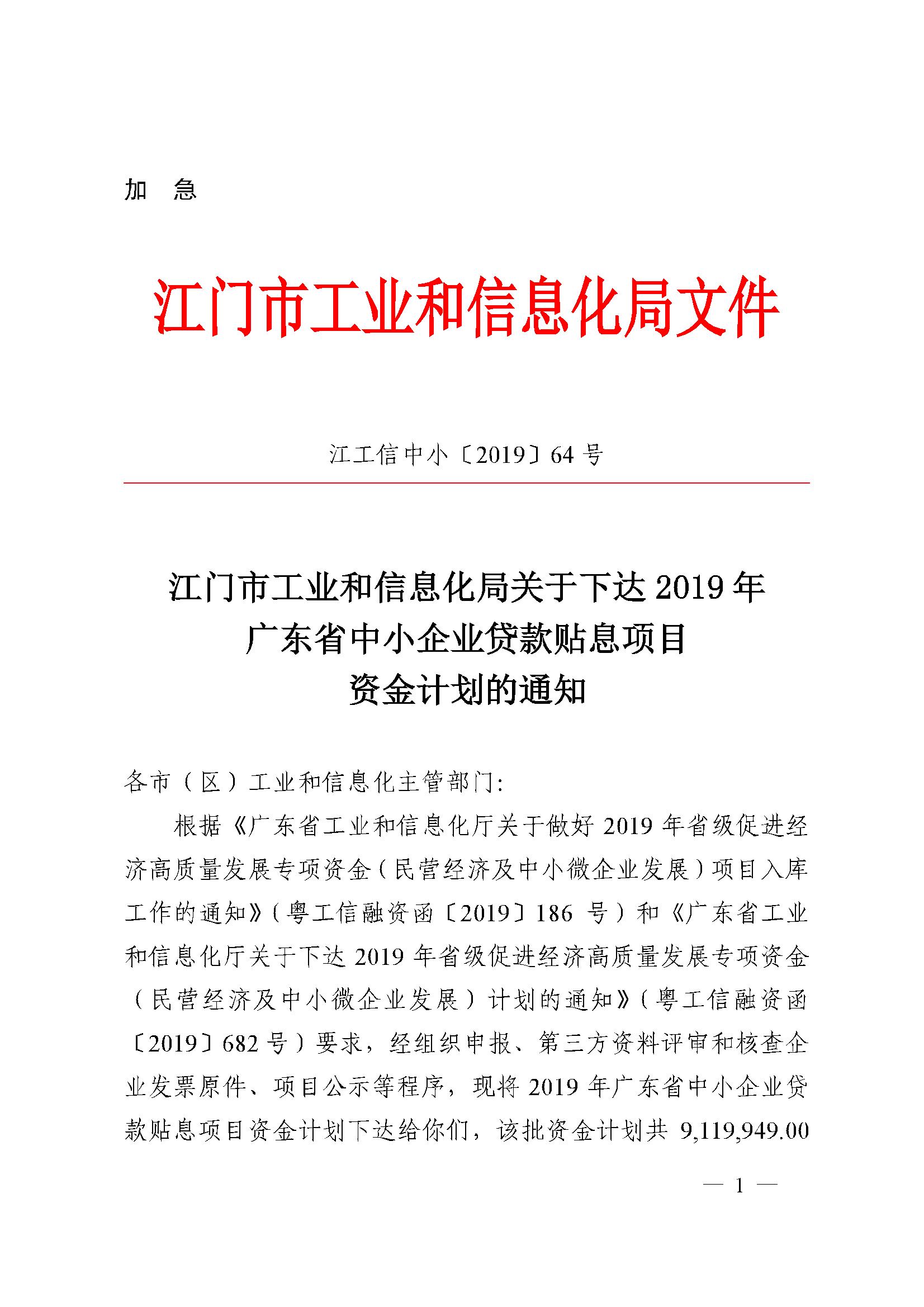 转发江门市工业和信息化局关于下达2019年广东省中小企业贷款贴息项目资金计划的通知