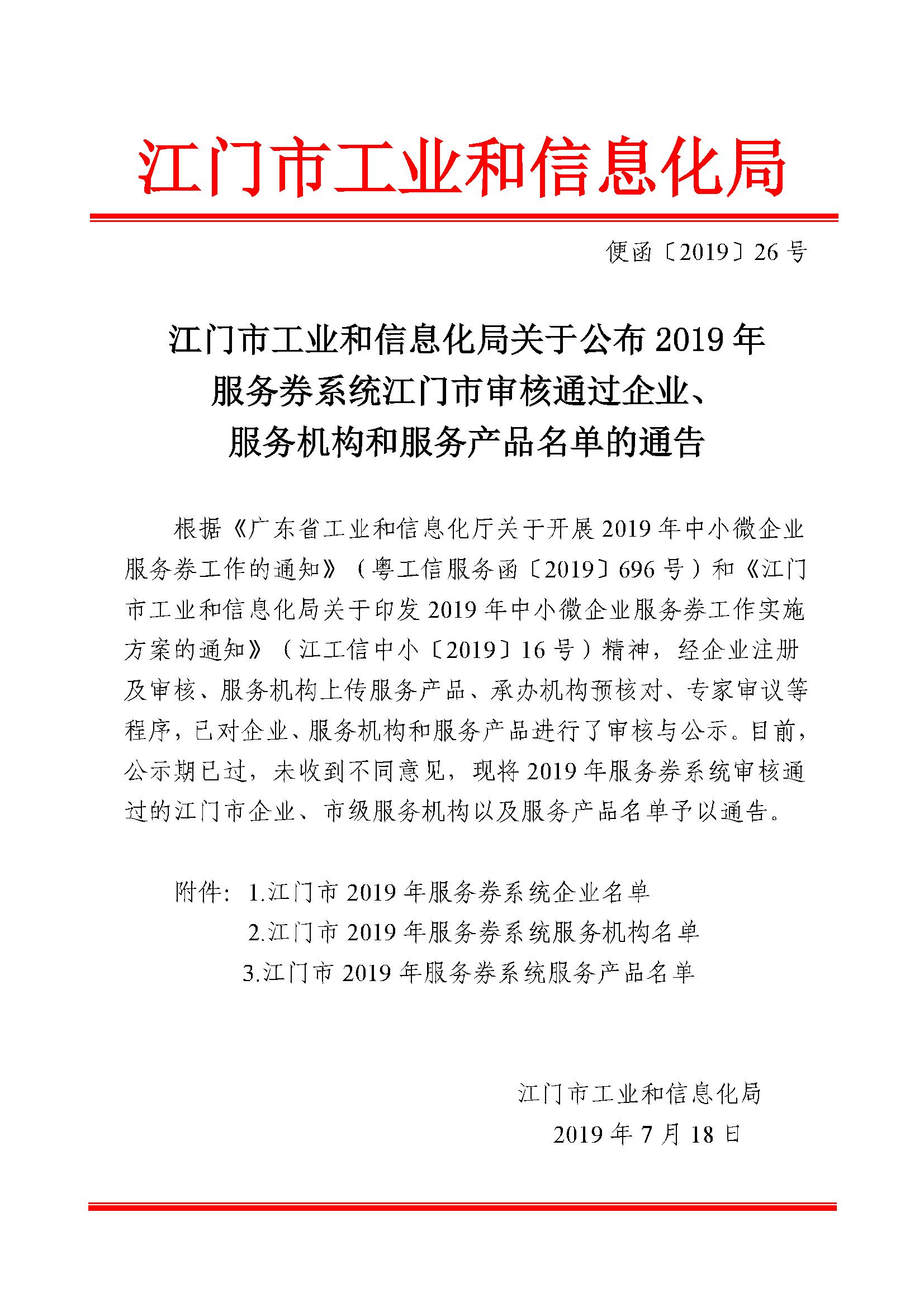江门市工业和信息化局关于公布2019年服务券系统江门市审核通过企业、服务机构和服务产品名单的通告