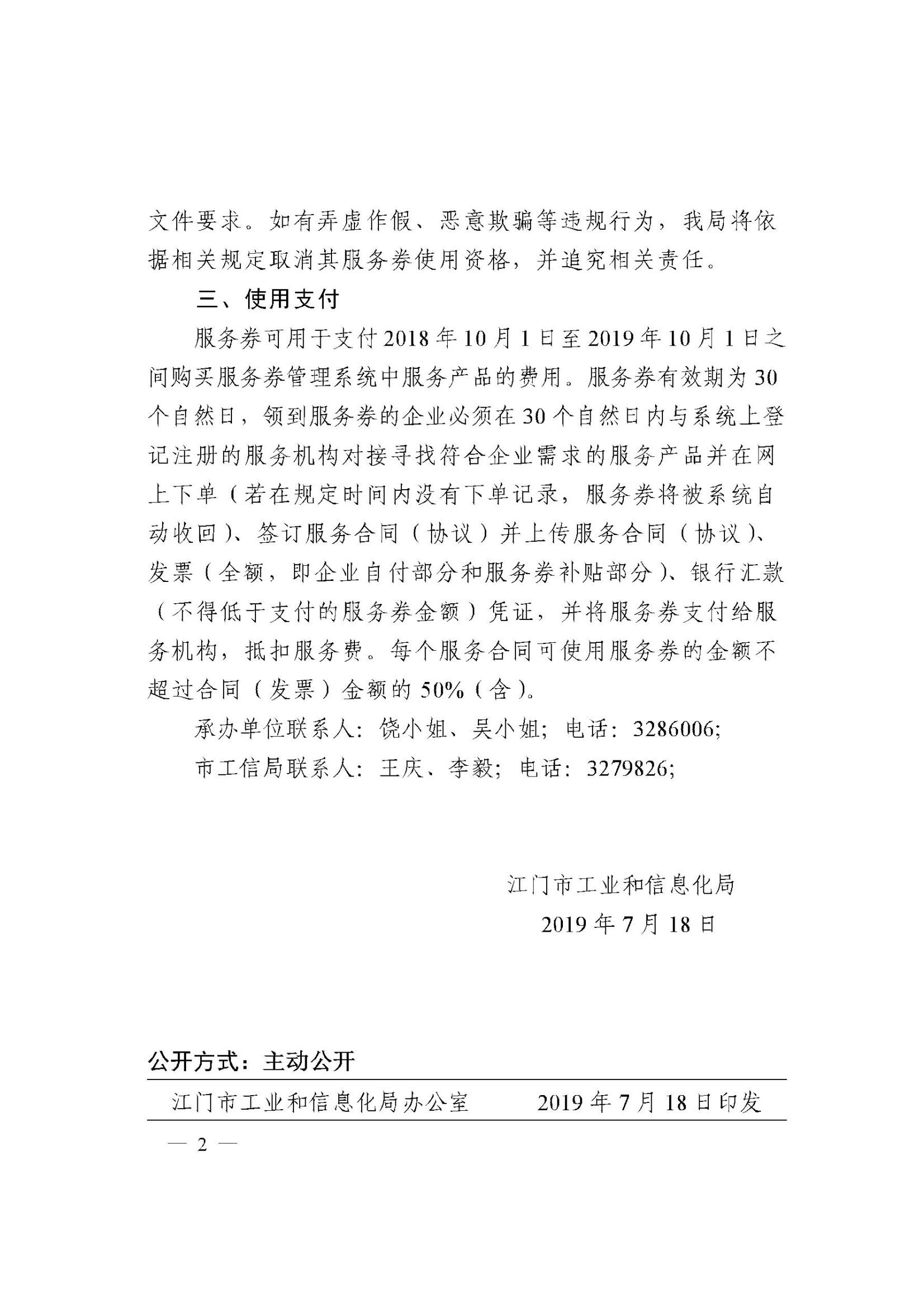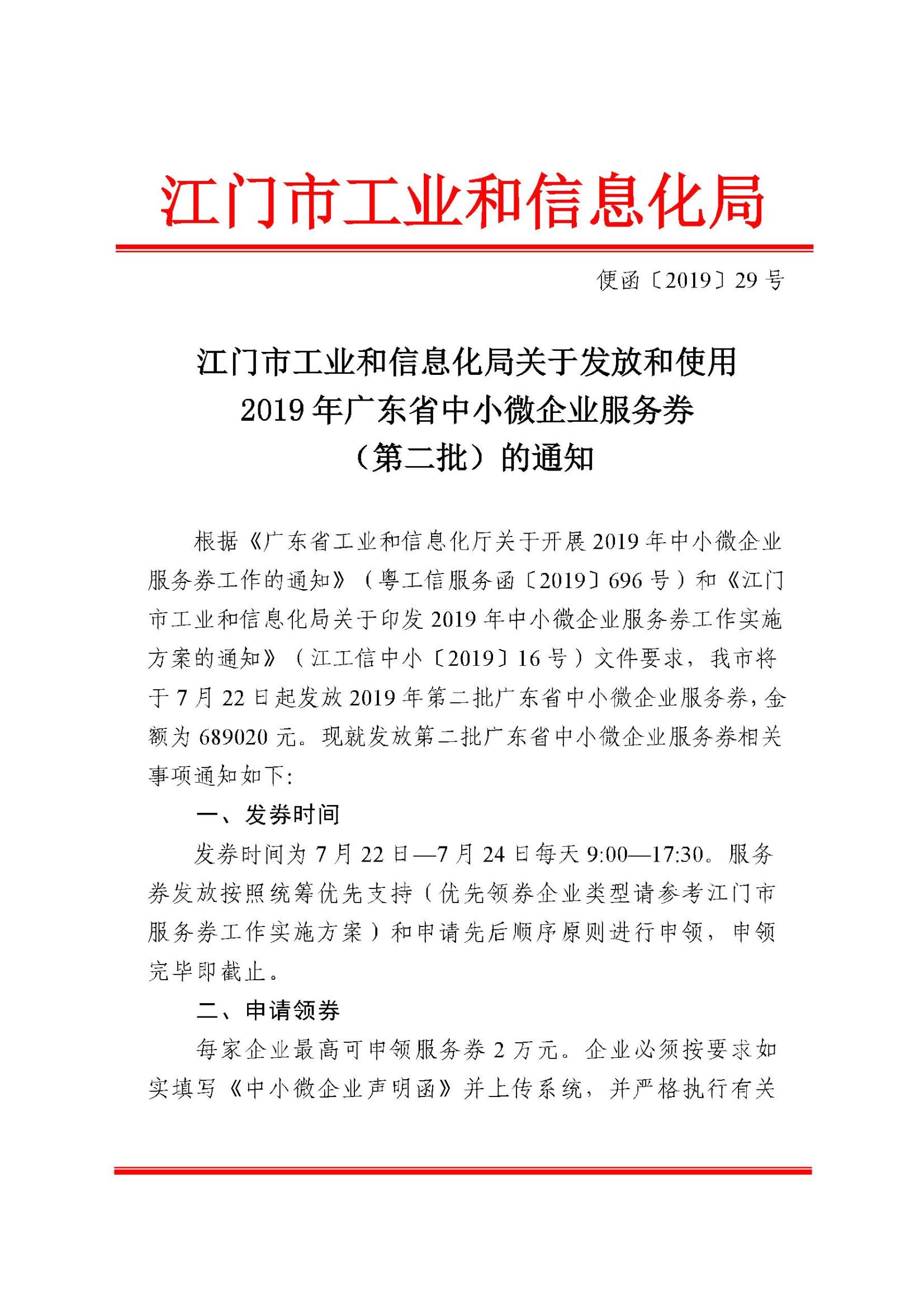 转发江门市工业和信息化局关于发放和使用2019年广东省中小微企业服务券(第二批)的通知