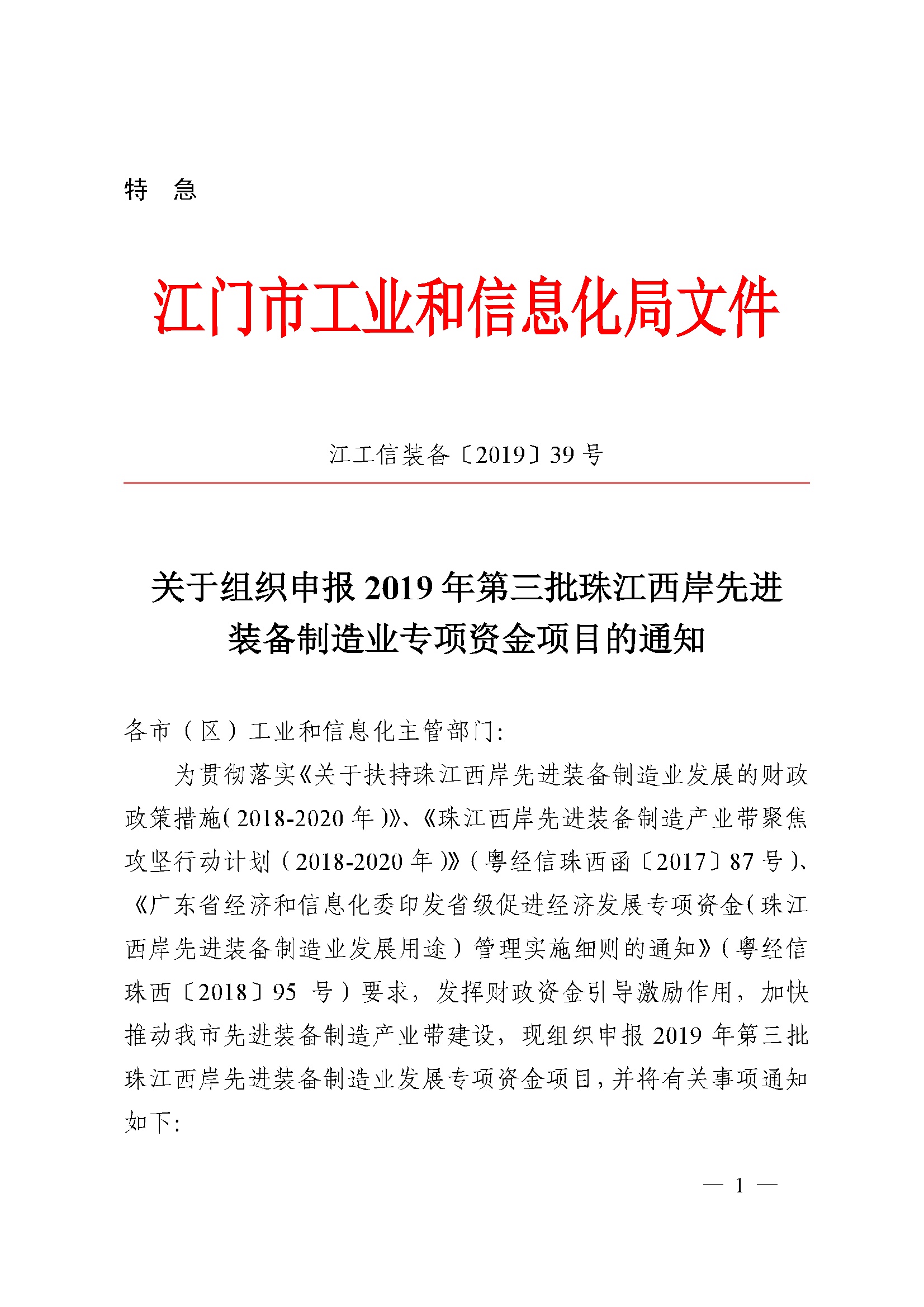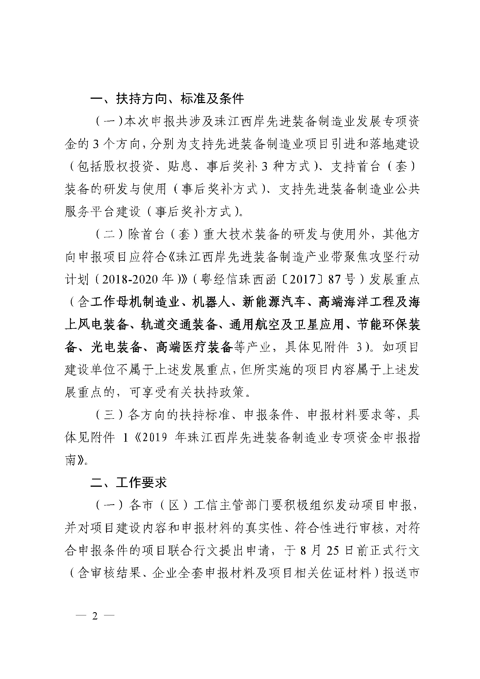 关于组织申报2019年第三批珠江西岸先进装备制造业专项资金项目的通知