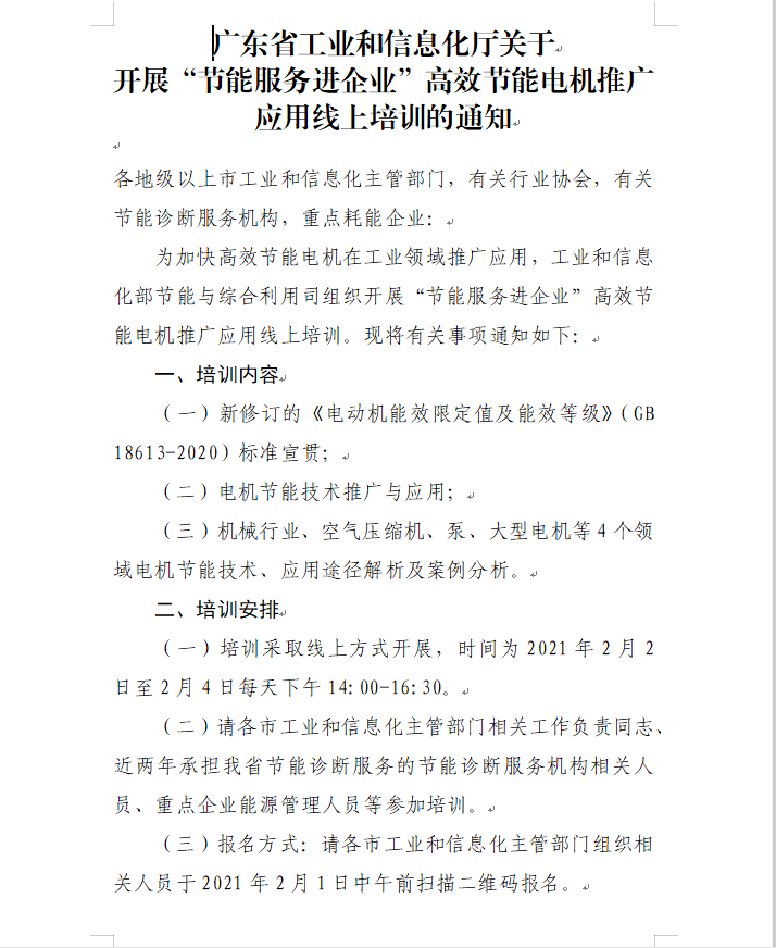 广东省工业和信息化厅关于开展“节能服务进企业”高效节能电机推广应用线上培训的通知