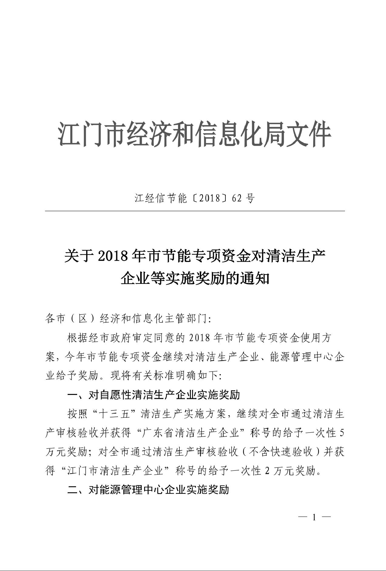 江经信节能[2018]62号_关于2018年市节能专项资金对清洁生产企业等实施奖励的通知