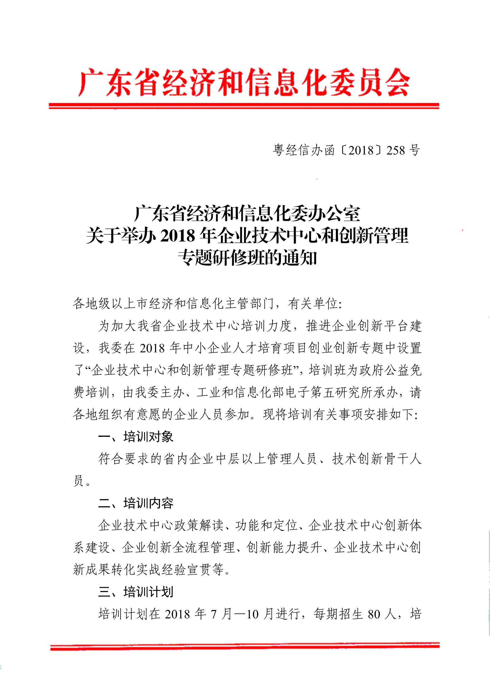 粤经信办函[2018]258号:广东省经济和信息化委办公室关于举办2018年企业技术中心和创新管理专题研修班的通知