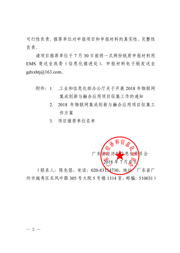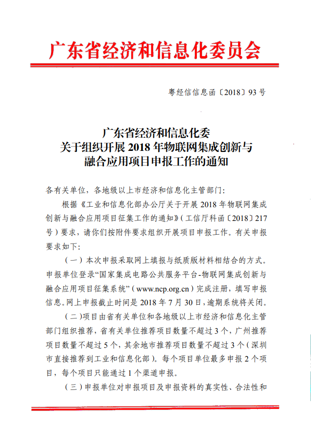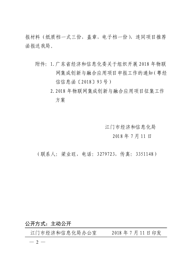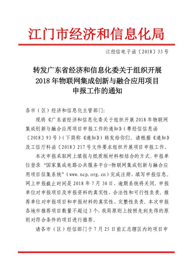 江经信电子函[2018]33号_转发广东省经济和信息化委关于组织开展2018年物联网集成创新与融合应用项目申报工作的通知