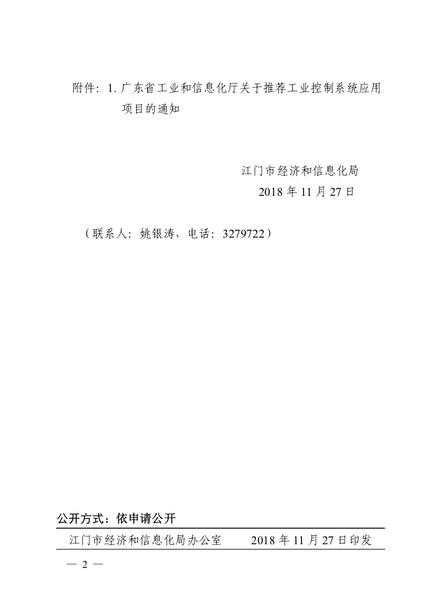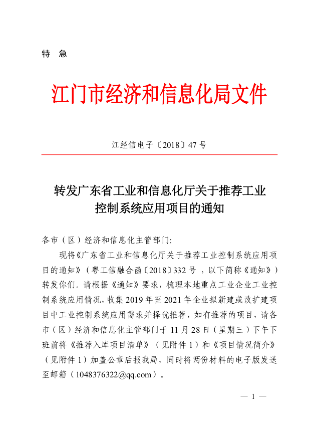 江经信电子[2018]47号_转发广东省工业和信息化厅关于推荐工业控制系统应用项目的通知