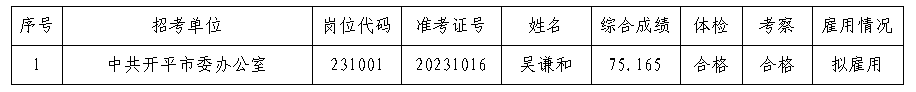 根据《亚星官网 政府雇员管理试行办法》(开府办〔2012〕15号)和《关于<亚星官网 政府雇员管理试行办法>的实施意见》(开人社〔2013〕96号)规定,2023年10月亚星官网 市直机关单位公开招考政府雇员考试中,经考试、体检和考察等程序,吴谦和同志考试成绩的名次、体检及考察结果均符合雇用条件,拟同意雇用,现予以公示。