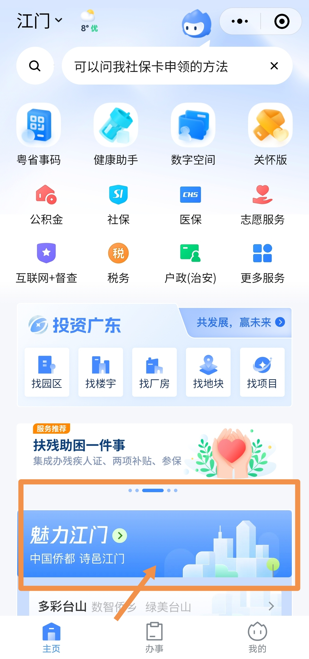 “粤省事”是面向个人的民生服务微信小程序,我市开设了“魅力江门”专区,上线了“养老资格认证”“社保卡领取基本养老金”“引进博士、出站博士生活补贴”“引进博士、出站博士购房补贴”“在站博士生活补贴”“专业技术人员职称晋升补贴”“申请创业补贴”“办理灵活就业人员服务”“企业职工正常退休”等9项人社服务事项。