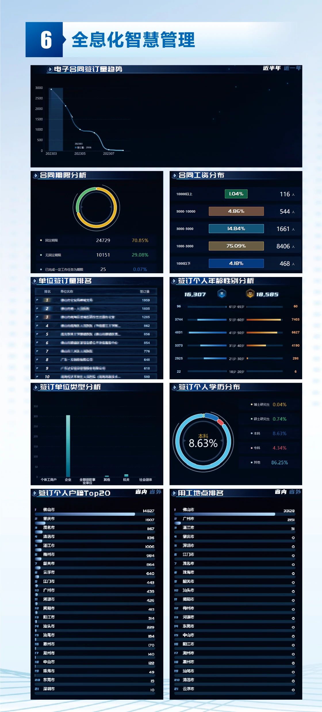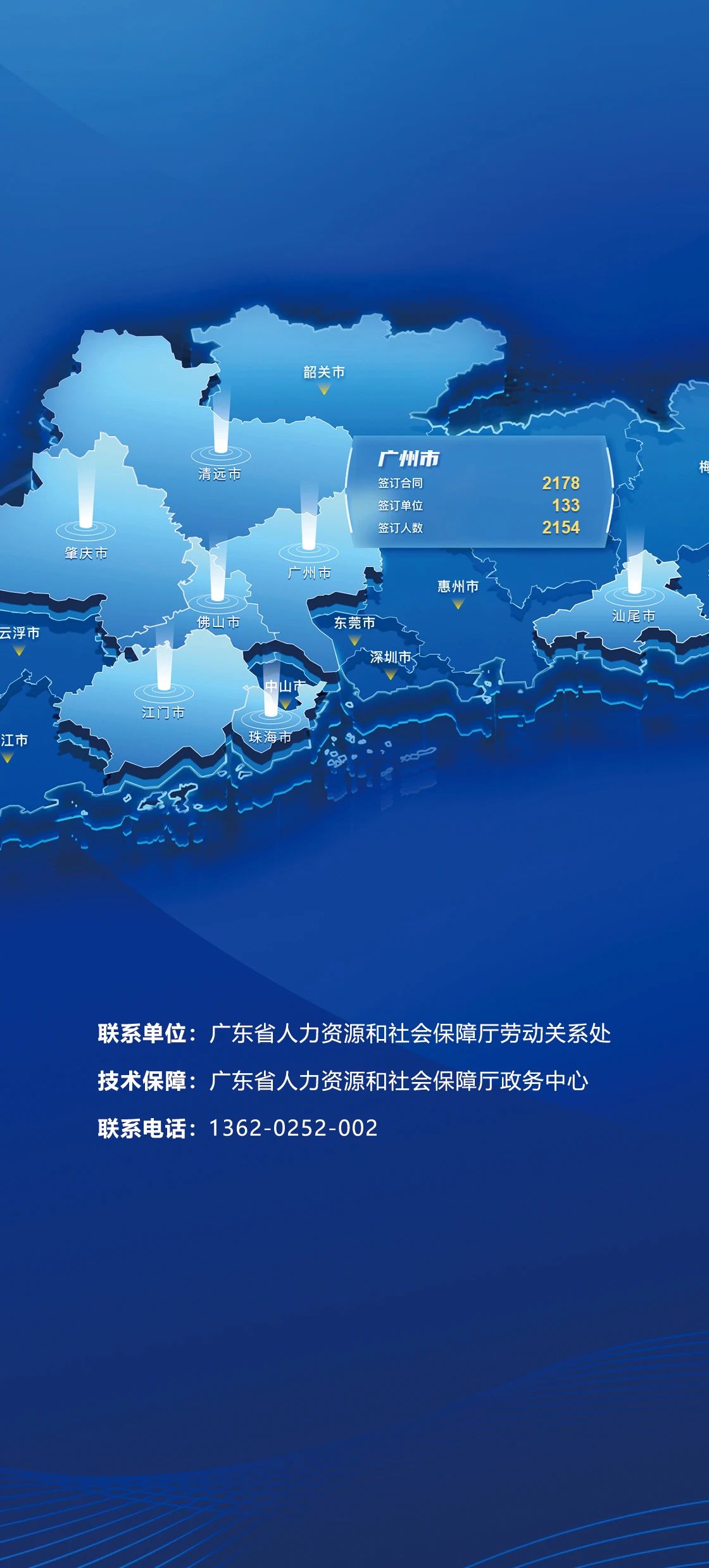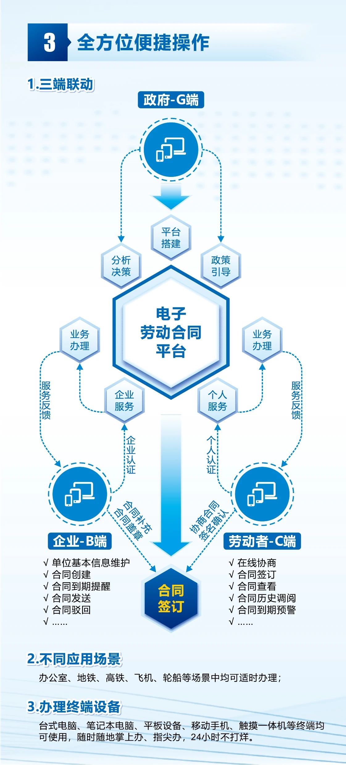 广东省电子劳动合同平台为广东省人力资源和社会保障厅开发建设,是面向全省人社系统、用人单位和劳动者提供全链条、全周期的电子劳动合同签订、管理和服务的数字化平台。该平台充分运用互联网、区块链、大数据、云计算、人工智能等信息技术,集劳动合同签订、审验、存贮、管理、监测、统计分析等线上信息服务功能于一体,实现“线上签约、链上管理、大数据应用”的数字化工作模式,形成全数据上链和不可抵赖的“确权+维权”机制,打造人社部门、用人主体、劳动者“三位一体”应用端口,构建省、市、县(区)、镇街、村居“五级联动”数据管理应用体系,延伸企业内部全流程合同审批管理应用场景,已初步实现与劳动争议调解仲裁、劳动保障监察执法业务协同,下一步还将与就业失业登记、社会保险经办等人社场景及外部业务联动对接,具有高度的便捷性、安全性、融合性、开放性特点。