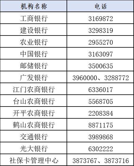 如有社保卡相关疑问,可致电江门社保卡管理中心或各社会保障卡合作银行服务热线咨询: