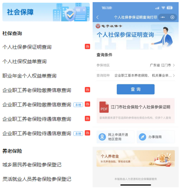 社会保障服务。可以查询和下载个人社会保险参保证明、查询缴费信息、办理参保登记、养老金测算、开立个人养老金等多项业务,守护您的个人权益。