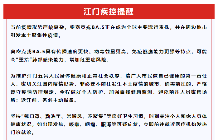 发布 江门疾控重要提醒 7月以来广东省内疫情多点散发,波及省内多个地市,7月13日中午,广东省珠海市召开疫情防控新闻发布会披露珠海本轮疫情通过基因测序显示,新冠病毒基因属于奥密克戎BA.5.1进化分支。该进化分支具有传播速度更快、病毒载量更高、免疫逃逸能力更强等特点,可能会“重拾”肺部感染能力,增加危重症风险。 为保障我市人民群众身体健康和生命安全,江门疾控再次发出重要提醒: 1、倡导外市来(返)江人员进行核酸“3天两检”。3天内完成两次核酸检测(间隔24小时以上,第1、3天),并做好自我健康监测。期间建议不聚集,不串门,不去人员密集的场所,外出时严格做好个人防护。 2、主动报备。请近7天有本土阳性感染者、国内高中低风险地区或参照高中低风险地区管理地区旅居史的来(返)江人员及时向所在社区(村)、宾馆、酒店报备,并积极配合落实健康管理各项防控措施。具体管控措施参照“健康广东”公众号每日公布的“重点地区来返粤人员健康管理措施”执行。 3、合理安排出行。当前国内疫情多点散发与局部暴发并存,疫情形势严峻复杂。请广大市民群众密切关注疫情发展动态,如非必要,避免前往中高风险地区及疫情相关地区。如必须前往,请全程做好个人防护,返江后要主动报备,并接受相应的健康管理措施。 4、做好自己健康的第一责任人。严格落实个人疫情防控责任,强化自己是健康第一责任人意识,主动做疫情防控参与人,构建群防群控的防线。如有出现发热、干咳、乏力、咽痛、嗅(味)觉减退、腹泻等不适症状时,尽早到附近医院发热门诊就诊,并告知医生旅居史,不要自行用药;就医途中全程佩戴口罩,避免乘坐公共交通工具。 5、严格落实工业园区、企事业单位主体责任。工业园区、企事业单位应当落实疫情防控主体责任,坚持“谁用工谁负责、谁受益谁负责”原则,管好自己的人、看好自己的门,强化外来务工人员管理,建立招工、用工全链条管理机制,严格排查用工人员涉疫地区旅居情况,切实掌握本单位所属、外聘、外包、实习、劳务派遣等各类人员信息,建立基础台账,做到全部见底、一个不漏。 6、严格落实重点场所防控措施。民宿、网约房、酒吧、歌舞厅、洗浴场所、棋牌室(麻将馆)、网吧、电子游艺厅、密室逃脱、剧本杀等重点场所;旅游景区、公共文化馆、图书馆、博物馆、影院剧场等文旅场所和交通场站、商场超市、宾馆酒店、农贸市场、宗教寺庙、餐饮场所等人员密集场所按照“限流、预约、错峰”原则,严格落实戴口罩、测温、亮码和扫码通行要求,以及通风换气、清洁消毒等常态化防控措施。 7、少出门、不聚集。公共场所人员多、流动大,聚餐、聚会易导致呼吸道传染病传播。人多场所不要去,拥挤场所要回避。少出门、不扎堆。亲戚、朋友、同事之间近期不聚会、不聚餐,尽量避免前往人群密集的公共场所,提倡红事缓办、白事简办、宴会不办,暂停人员聚集群众性活动,最大限度减小疫情输入和传播风险。 8、积极接种新冠疫苗。接种新冠病毒疫苗是预防新冠肺炎最经济、最有效的手段,更是每一位公民应尽的责任和义务。符合接种条件的群众,尽早主动到附近的疫苗接种点完成疫苗接种,早日建立全民免疫屏障。 我市已连续四日社会面阳性感染者零新增,这来之不易的攻坚成果凝聚着广大党员干部、医护人员、公安干警、社区工作者、志愿者的日夜付出、无私奉献以及全体市民的理解支持、鼎力配合。疫情防控是一场没有旁观者的全民行动,让我们携手并肩,凝聚起同心抗疫的共识,人人响应、人人参与、人人自律,共同维护疫情防控良好秩序,全力守护美好家园! 必看!重点地区来返粤人员健康管理措施(7月13日) 来源:健康广东 疫情之下出行, 人们可能有这样的困惑: “我属于哪类人群?” “来返粤应遵守哪些健康管理措施?” 大家注意了, 重点地区来返粤人员健康管理措施 每天动态更新~ 重点地区来返粤人员 健康管理措施 【相关信息】 来源 |人民网(2022年7月13日)