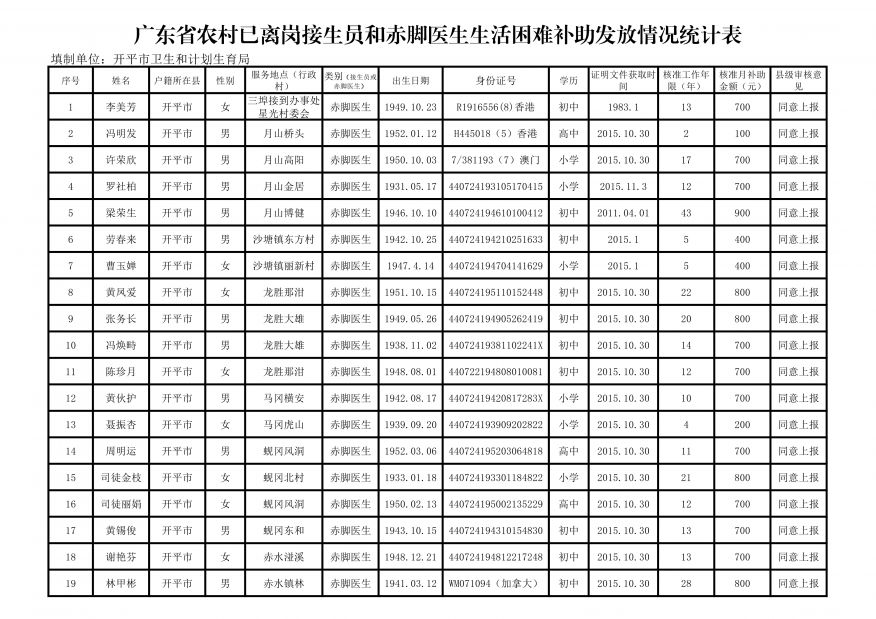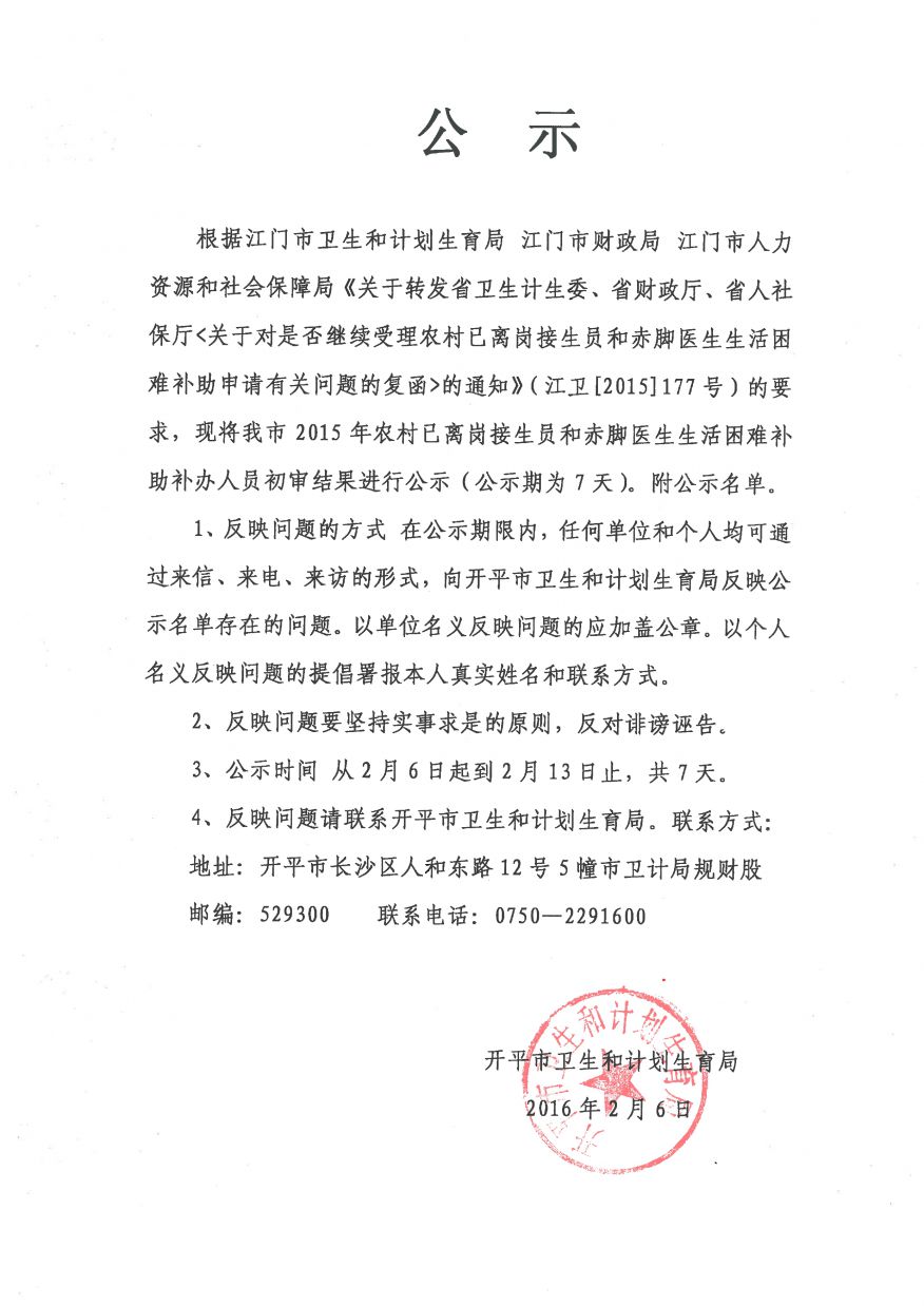 亚星官网 2015年农村已离岗接生员和赤脚医生生活困难补助补办人员初审结果公示