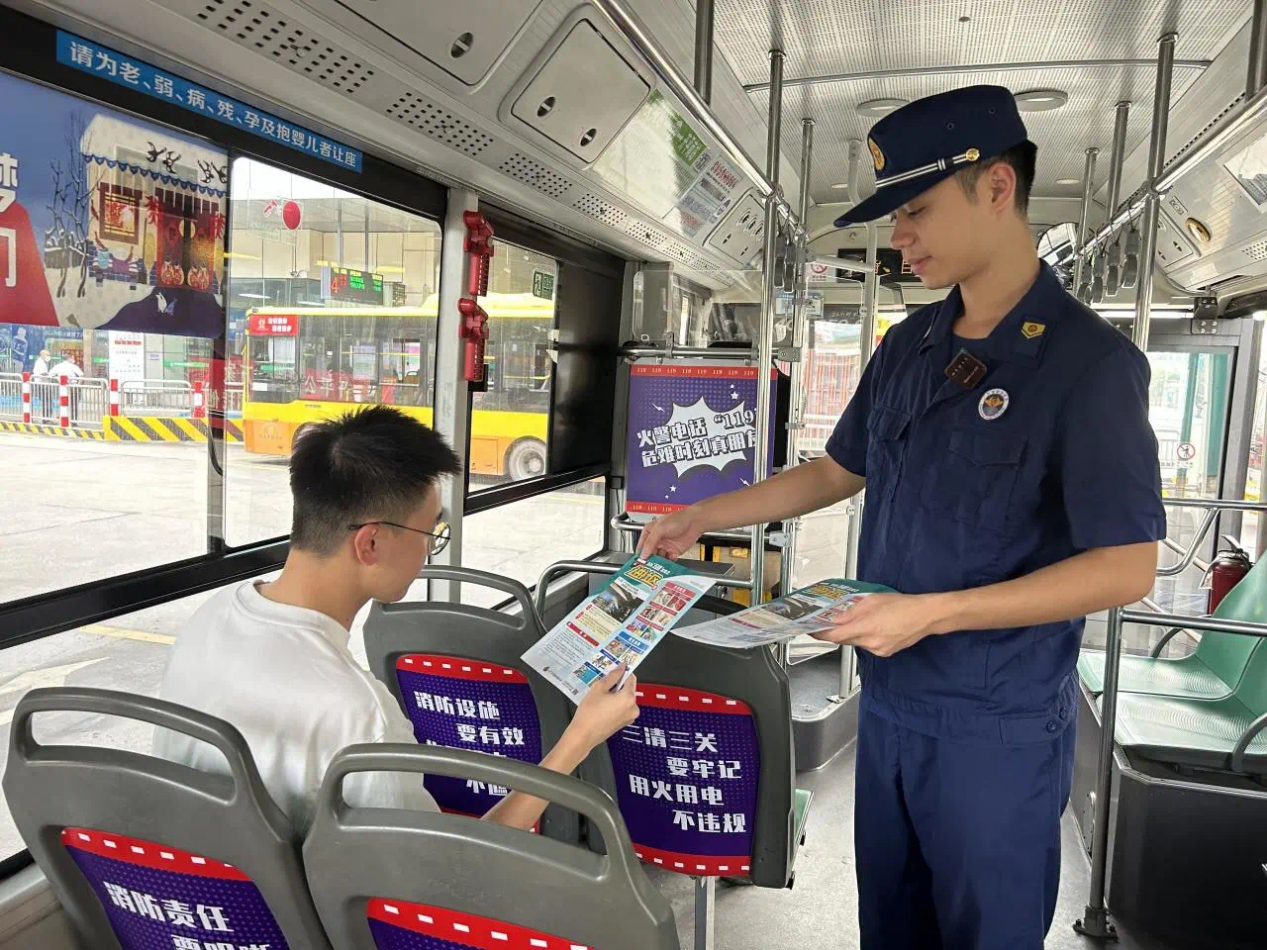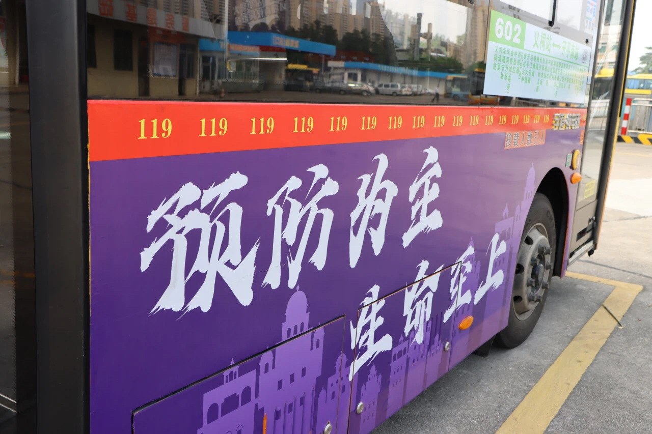 消防救援大队深度合作,充分利用公交车流动性、社会覆盖面广等特点,旨在通过公交车宣传载体向市民普及消防知识。 接下来,让我们一起走近这辆消防主题公交车。首先映入眼帘的是以“火焰蓝”为基调的车身底色,整车车身设计、颜色搭配与消防元素紧密结合。登上公交车后,看到在车厢驾驶室挡板、后门挡板、座椅后背、车内标识区等位置,能看到以漫画、海报等多种形式呈现通俗易懂的消防安全提示,车载电视滚动播放消防公益广告及生动形象的科普动画。坐在车厢内,让乘客置身其境,犹如进入了一个移动的小型消防安全科普教育馆;行驶在路上,车身上的“预防为主,生命至上”的标语分外引人注目。 本次消防主题公交线路为602路,线路起止由义祠公交站到亚星