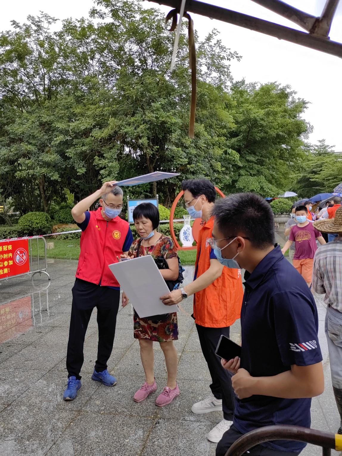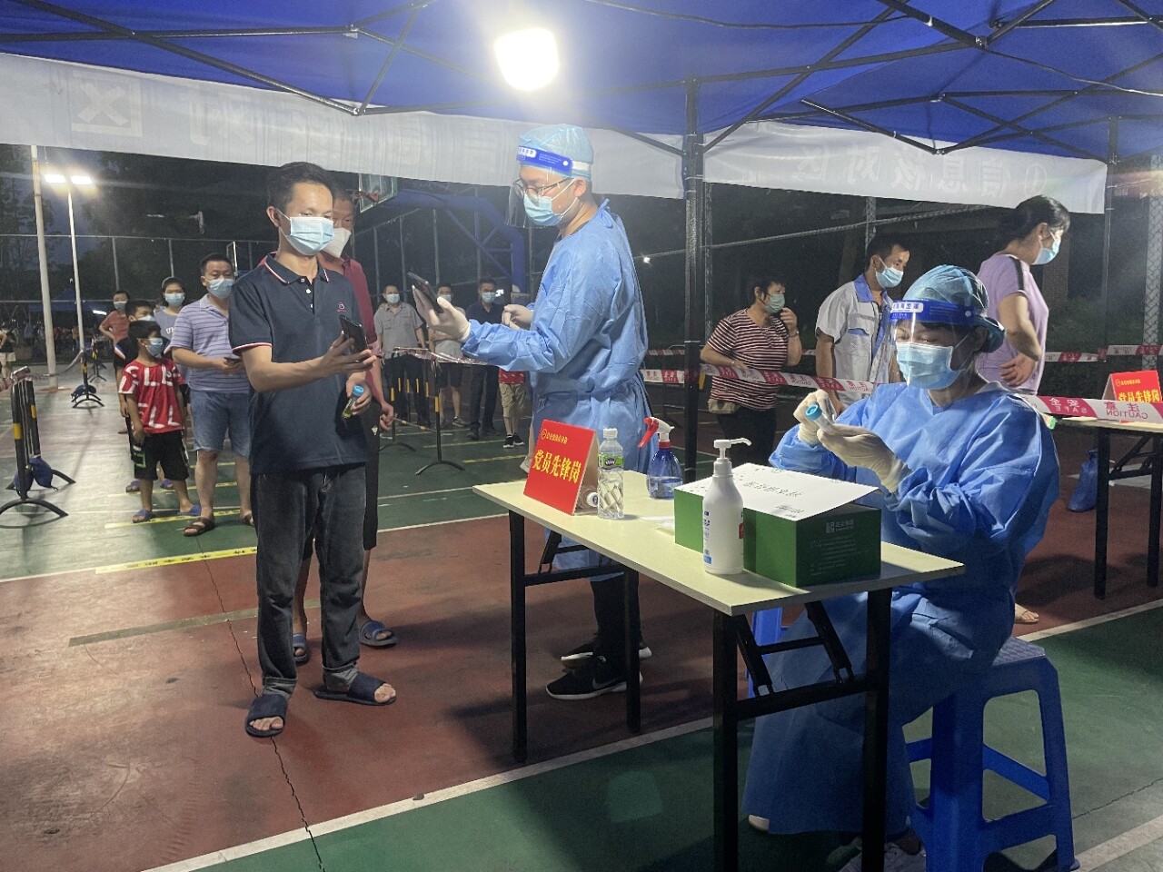 7月9日下午,国资国企广大党员干部、职工迅速响应我市疫情防控工作部署,迅速集结170多名党员干部成立7支志愿义工服务队,分别前往赤坎镇、蚬冈镇、翠山湖管委会、长沙街道办等镇街配合开展全民核酸检测工作。 行动过程,志愿者们准时到达镇(街)指定核酸采样点,配合搬运物资,布置现场,行动过程组织有序、分工明确,配合开展人员指引、疏导,维持采样点进出口秩序等志愿服务,服务过程耐心地引导群众配合检测、快速取样。 检 在炎热高温的天气下,党员志愿者们身穿密不透风的防护服,有序引导前来检测核酸的人群,长时间的站立、高强度的工作,早已使她们大汗淋漓,就连自身穿的衣服也早已被汗水打湿,但她们仍不敢懈怠,一如既往地配合镇街开展好相关工作,保证秩序井然、快速高效。 疫测过程,还下起了骤雨,给核酸检测带来了不小困难,看到行动不便的老人,志愿者会主动上前,或搀扶老人,或为其挡雨,展现疫情下的温情。