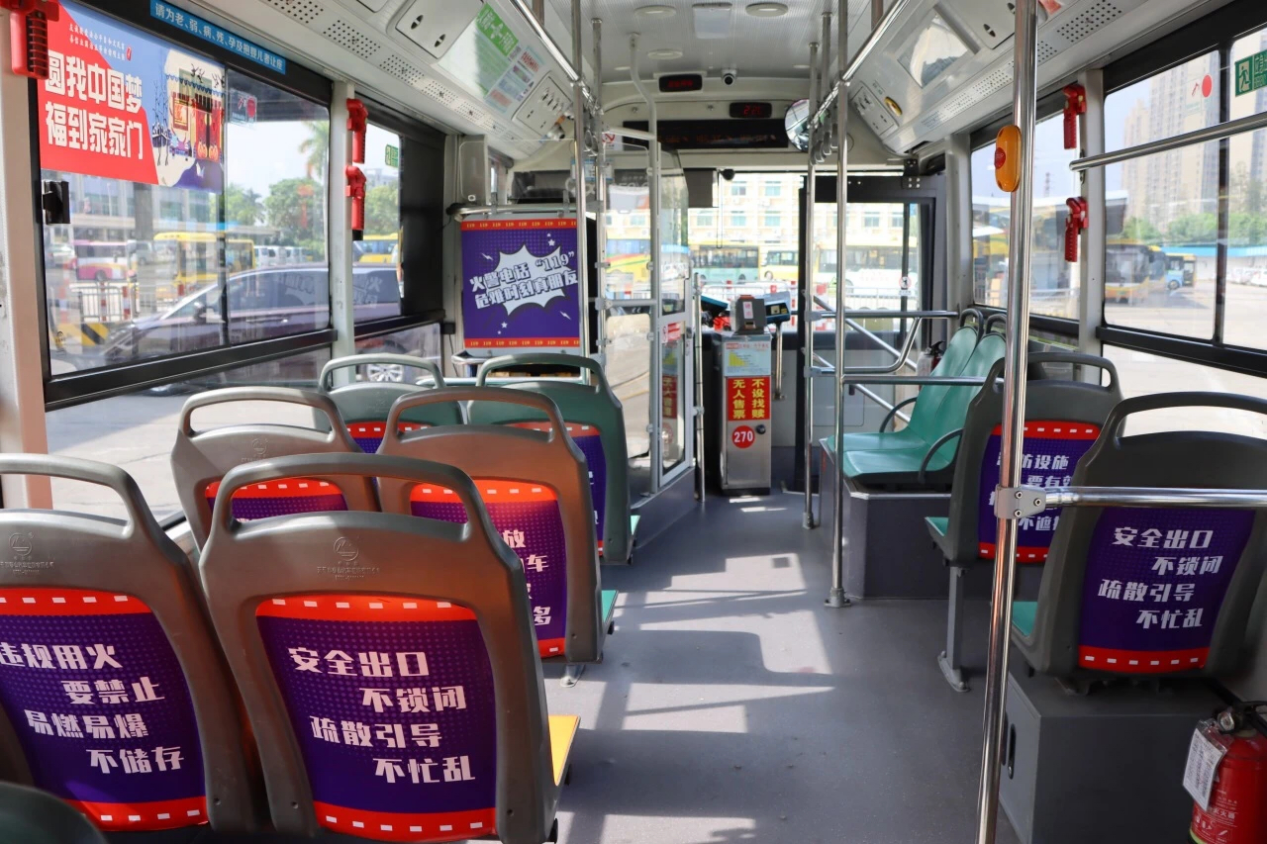 消防救援大队深度合作,充分利用公交车流动性、社会覆盖面广等特点,旨在通过公交车宣传载体向市民普及消防知识。 接下来,让我们一起走近这辆消防主题公交车。首先映入眼帘的是以“火焰蓝”为基调的车身底色,整车车身设计、颜色搭配与消防元素紧密结合。登上公交车后,看到在车厢驾驶室挡板、后门挡板、座椅后背、车内标识区等位置,能看到以漫画、海报等多种形式呈现通俗易懂的消防安全提示,车载电视滚动播放消防公益广告及生动形象的科普动画。坐在车厢内,让乘客置身其境,犹如进入了一个移动的小型消防安全科普教育馆;行驶在路上,车身上的“预防为主,生命至上”的标语分外引人注目。 本次消防主题公交线路为602路,线路起止由义祠公交站到亚星