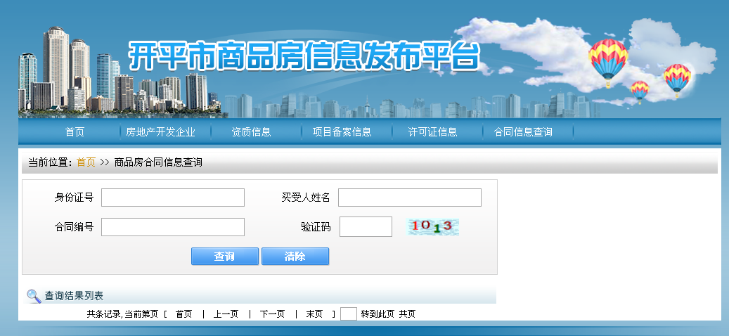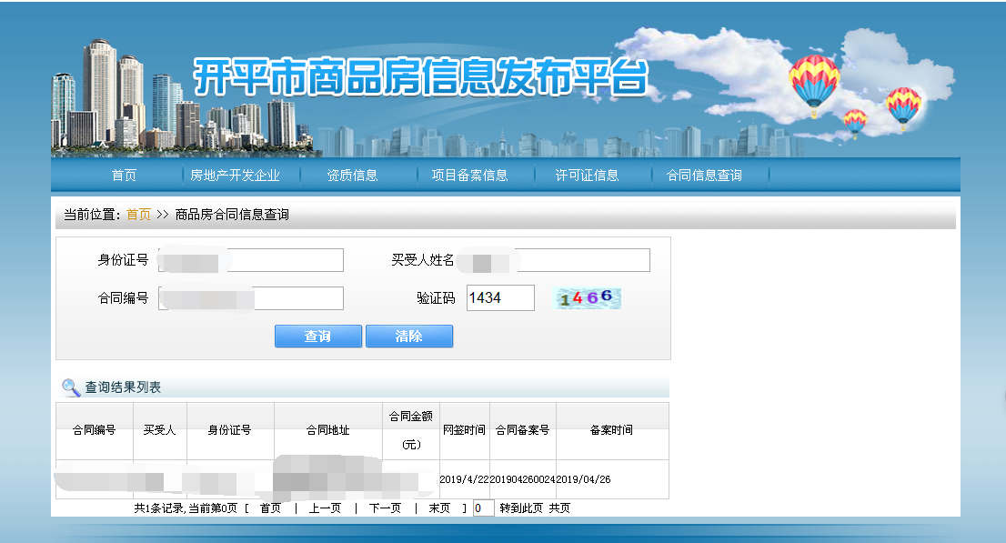 3、合同信息查询功能须正确填写“身份证号”、“买受人姓名”、“合同编号”、“验证码”才能进行查询。点击“查询”后可查询到该合同的相关信息。